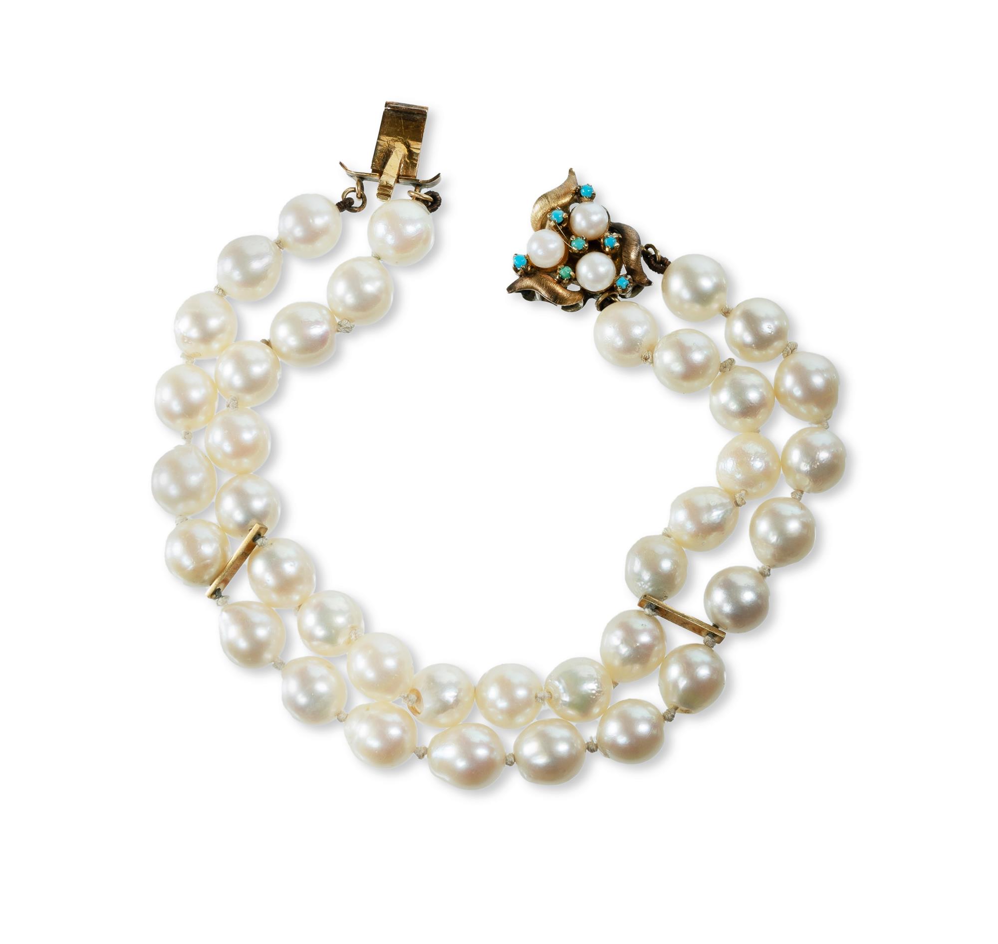Double Strand Pearl Bracelet Thirty eight semi baroque cultured pearl 2 strand pearl bracelet. Approx. 8mm pearls with 14ct three pearl and seven turquoise set clasp, and two spacer bars. (L21cm)Estimate $200-400