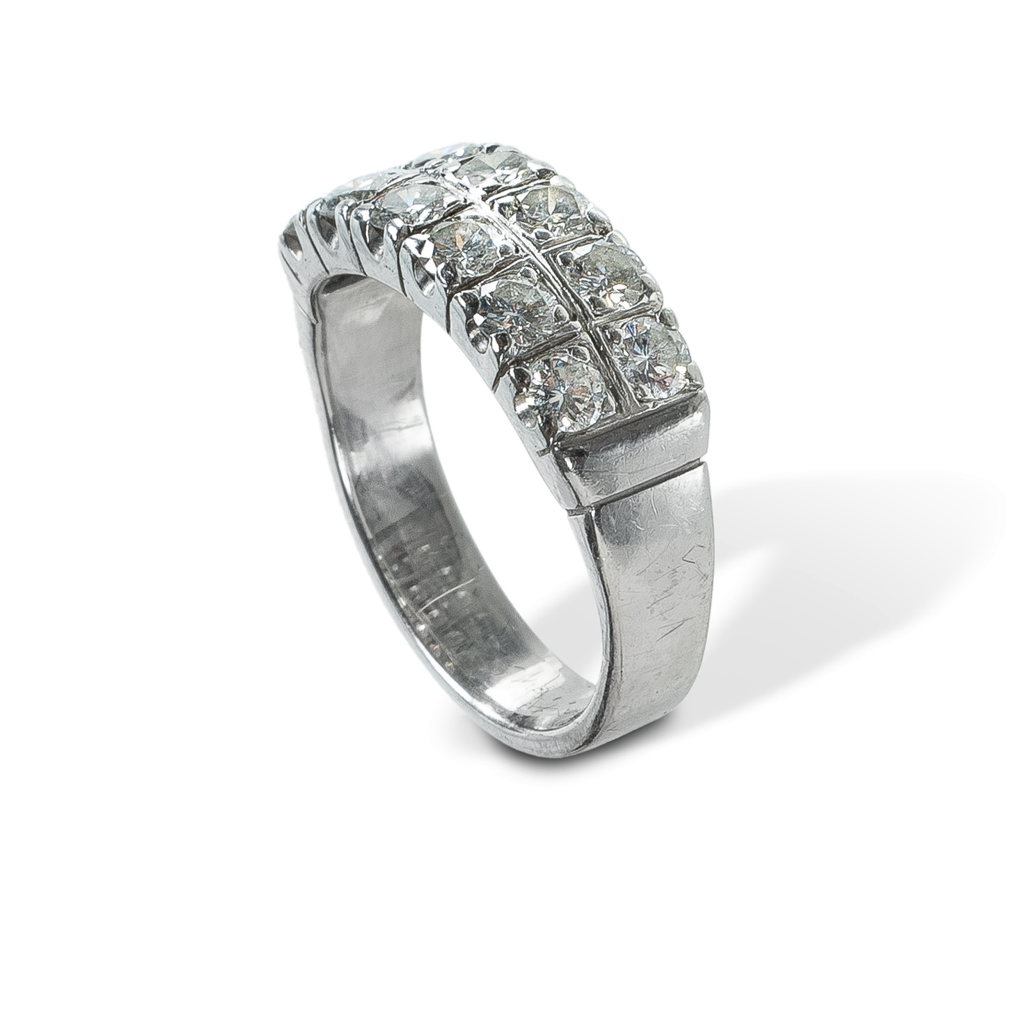 18ct White Gold Two Row Diamond Ring Two row inline ring set with 12 diamonds. Diamond total 1.30ct (approx) Size M1/2 (6 3/4) W5.2g (approx)Estimate $1,200-2,000