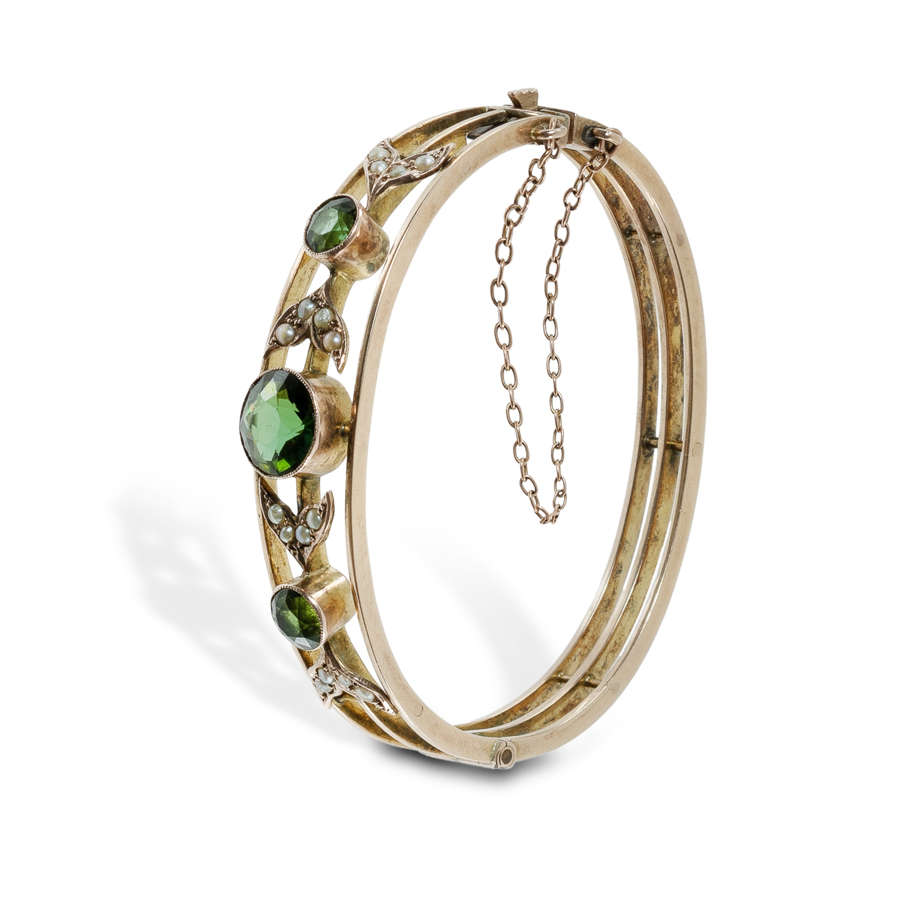 9ct Pink Gold Tourmaline and 1/2 Pearl Hinged Bangle Victorian/Edwardian 3 milgrain set tourmaline and 16 1/2 pearl hinged bangle. Tourmaline total 4.5ct (approx) W20.71g (approx) Estimate $550-1,100