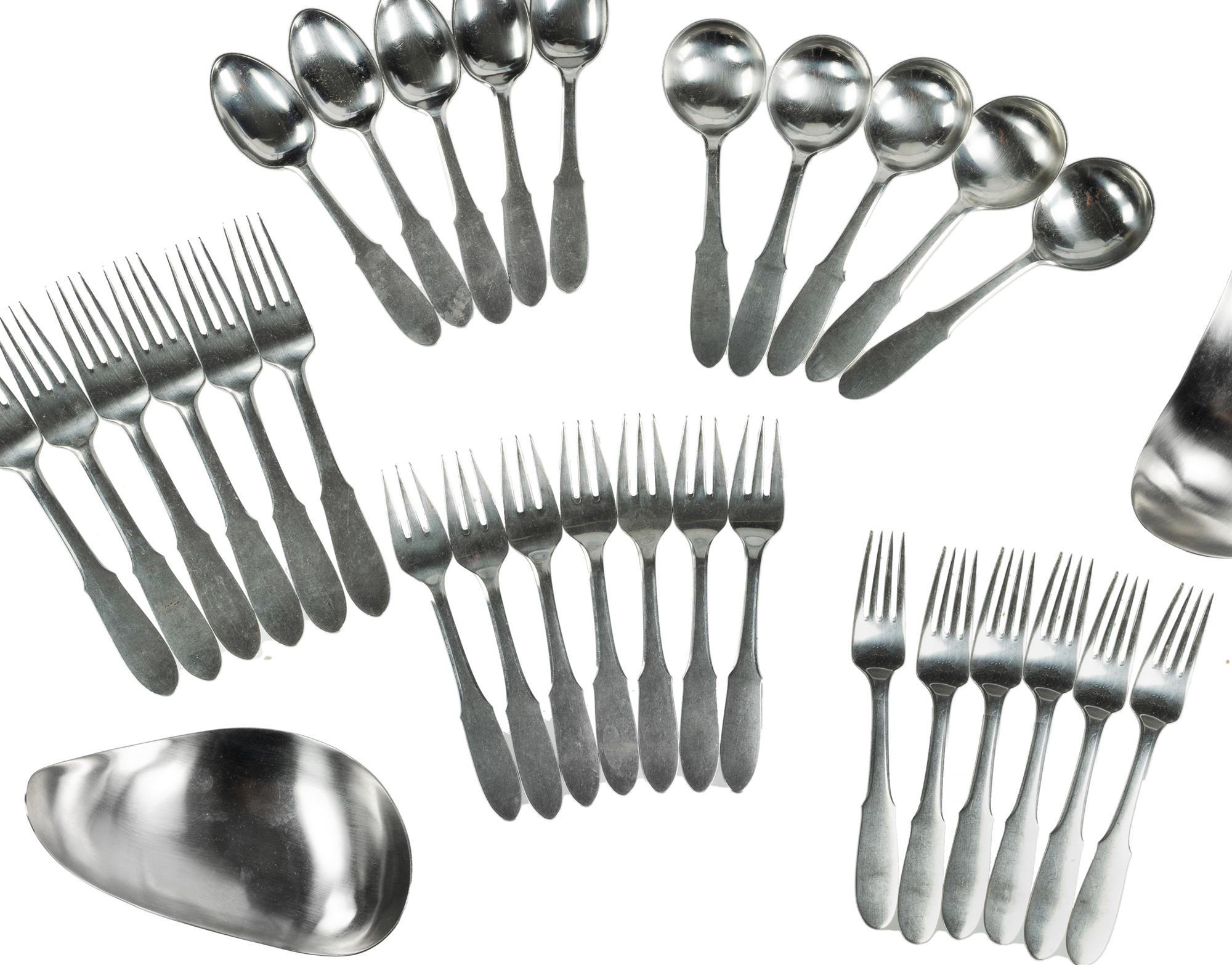 Georg Jensen Stainless Steel Flatware Part Service Including graduated pair of serving bowls. (30 pieces)Estimate $60-100