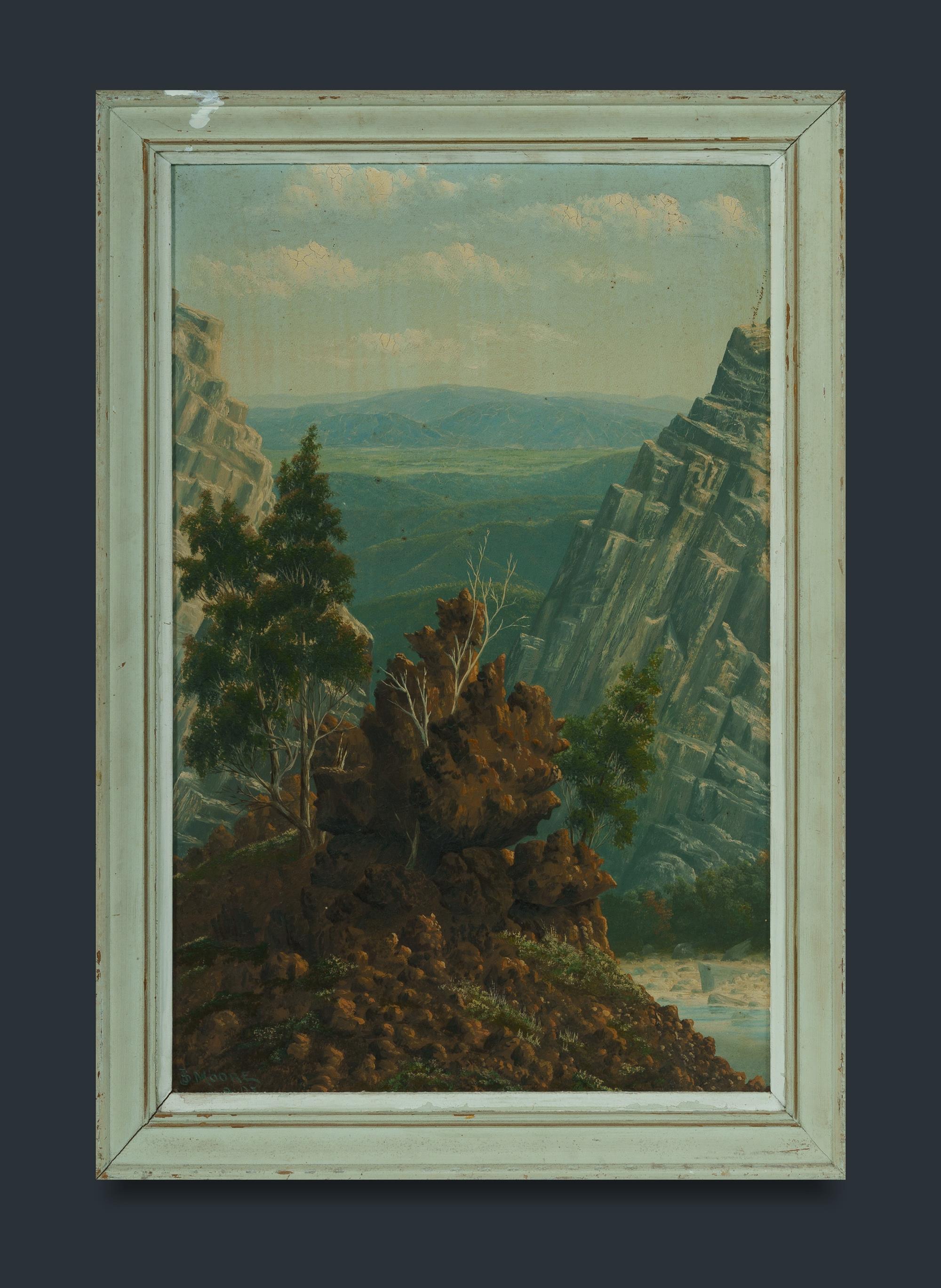 MOORE, J Stirling (1848-1920) 'A Cleft in The [?] Range 2 Miles from [?] depot, about 1300 Miles North of Adelaide,' 1903. Signed and dated lower left. Oil on Board 44.5x28.5cmEstimate $100-200
