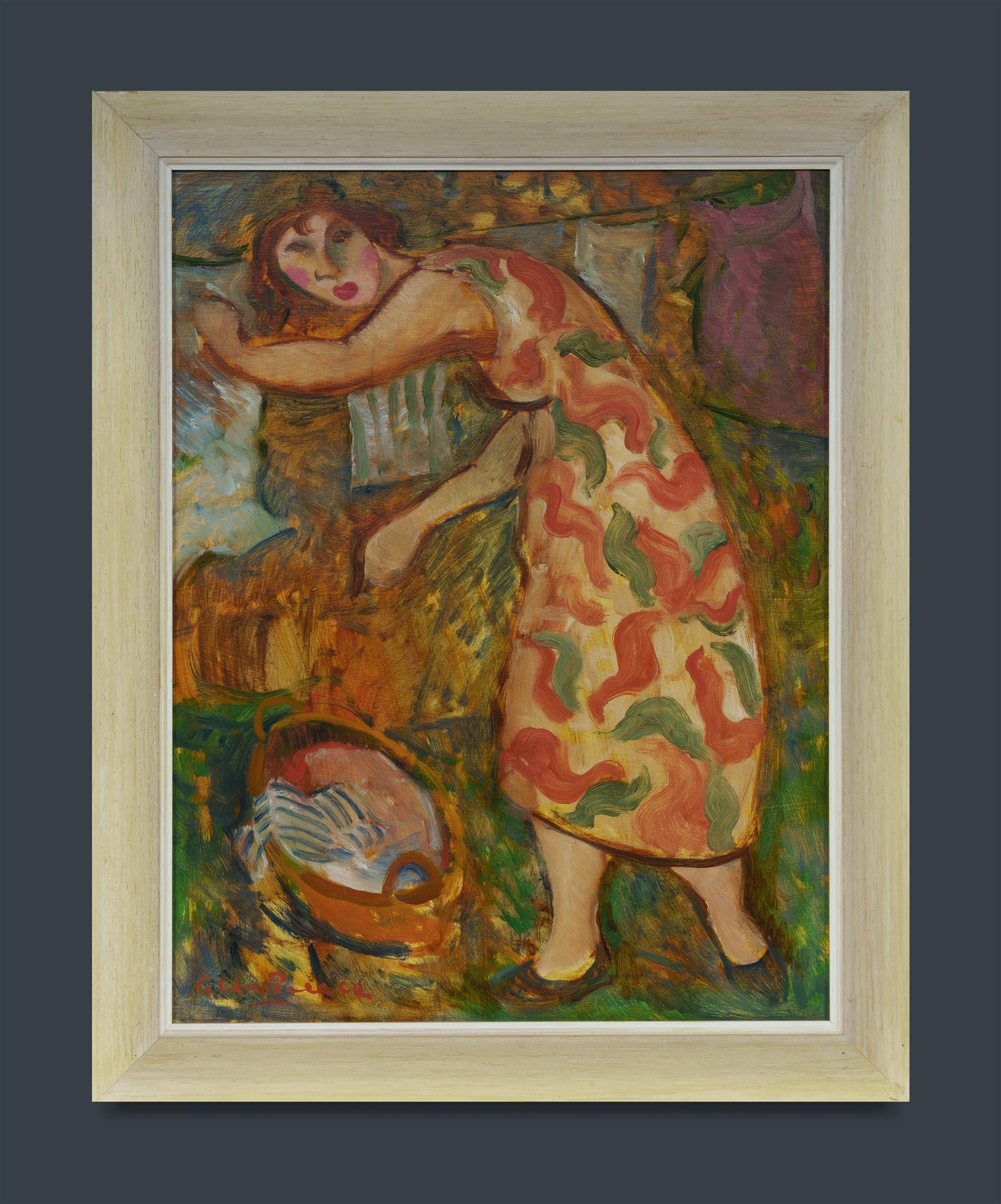 PREECE, Glen (b.1957) 'At the Clothesline' Old gallery label verso. Oil on Board 44.5x34.5cm PROVENANCE: The Estate of David Ross, Sydney; Shapiro Auctioneers, Sydney, 8th December 2020 (lot 476); private collection, NSW.Estimate $350-550