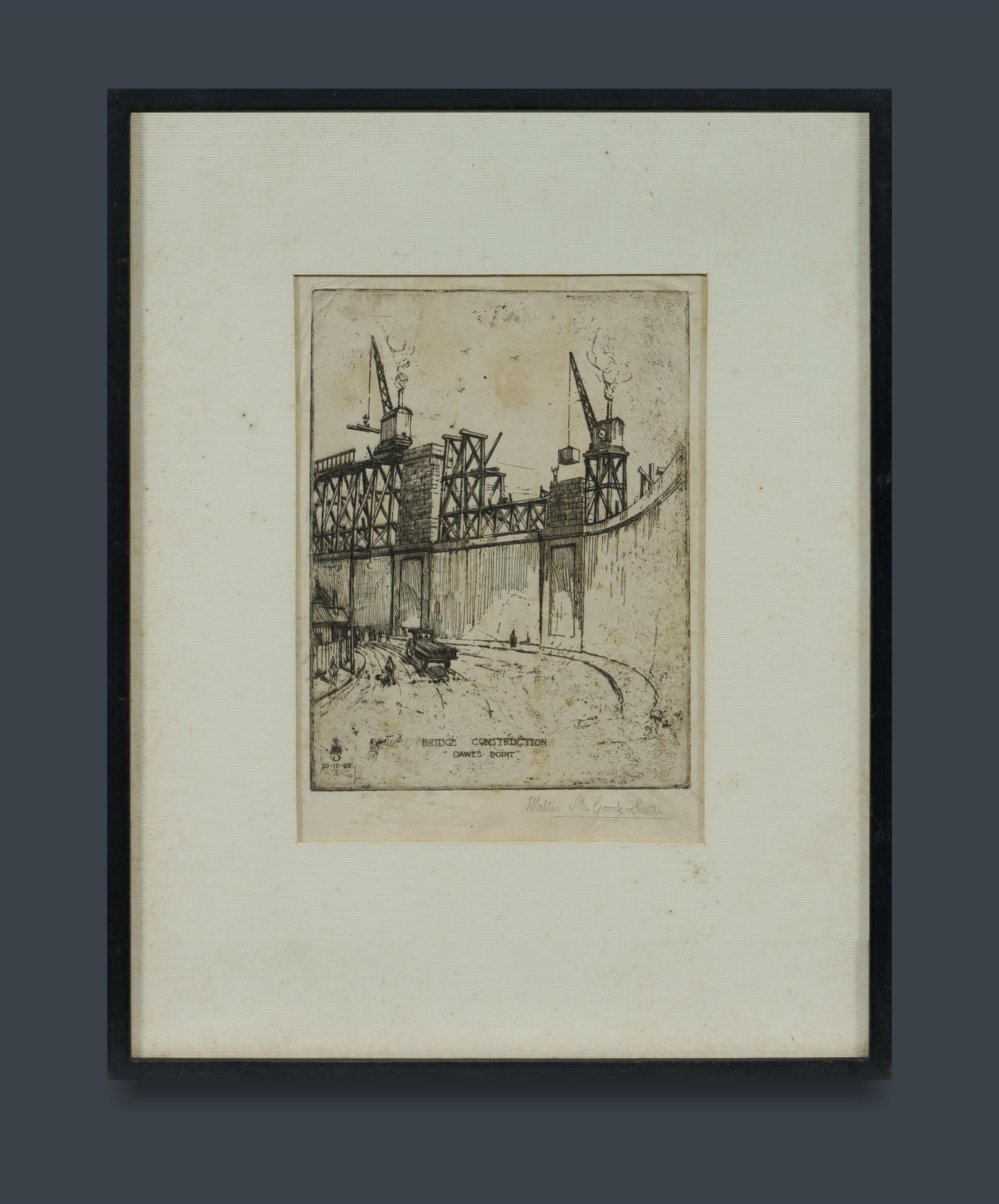 GOODE-SMITH, Walter M. (1875-1903) 'Bridge Construction - Dawes Point,' 1926. Signed lower right. Etching 20x15cm (plate) PROVENANCE: The Fred and Elinor Wrobel Collection, Sydney; Estate Late Elinor Wrobel.Estimate $100-200