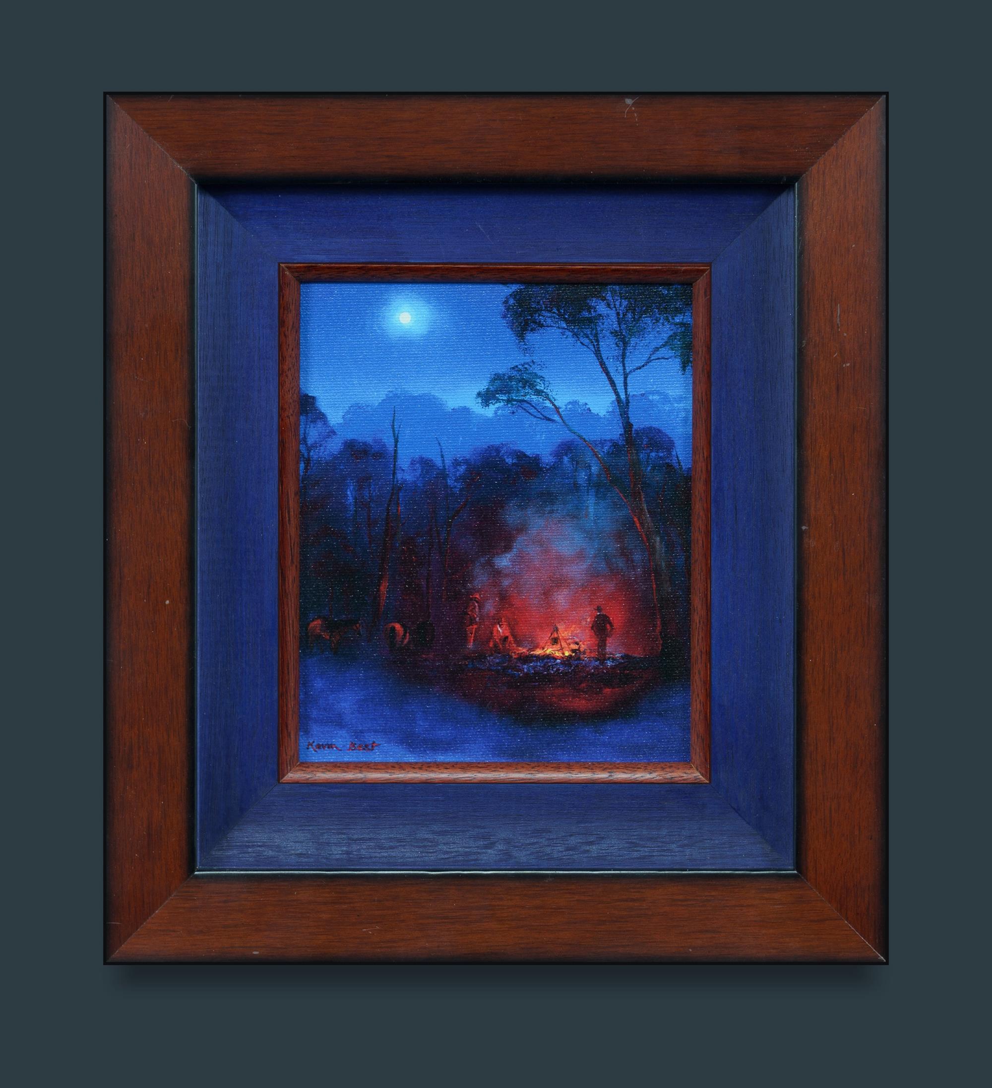 BEST, Kevin (1932-2012) Bush Camp at Night Personal gift inscription verso. Oil on Canvas on Board 15.5x13cmEstimate $100-200