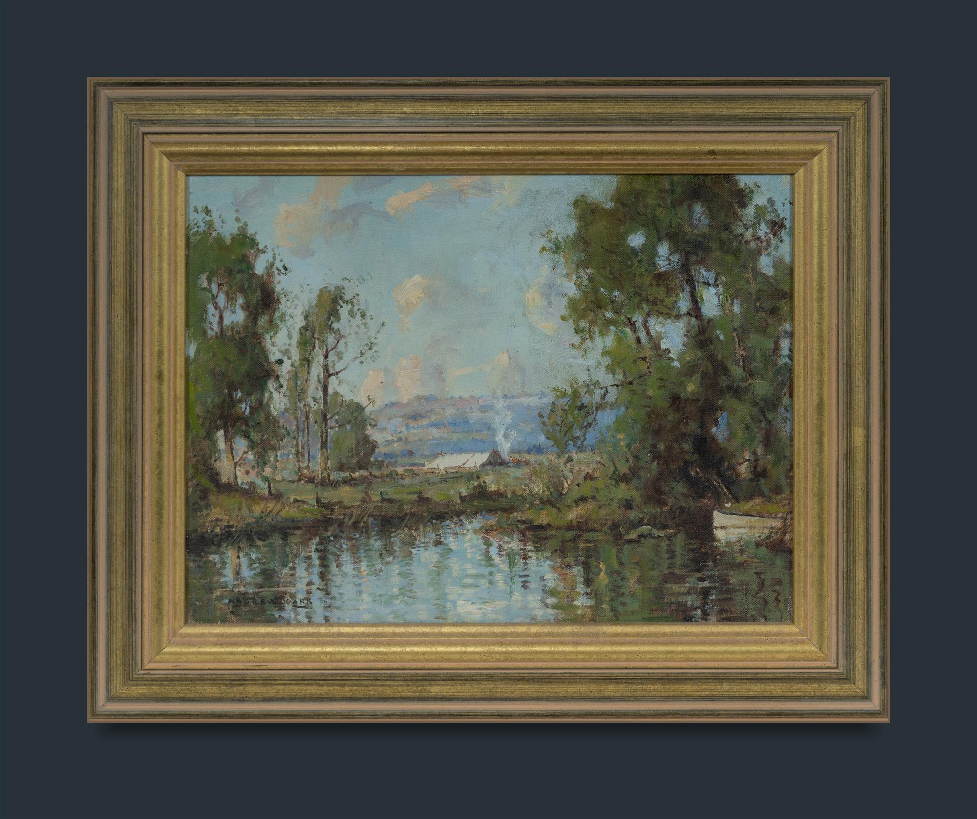 PARK, Andrew (working 1940s-1960s) River Campsite Signed lower left. Oil on Canvas on Board 29x39cm PROVENANCE: Davidson Auctions, Sydney, 29th March 2015 (lot 200)Estimate $150-300
