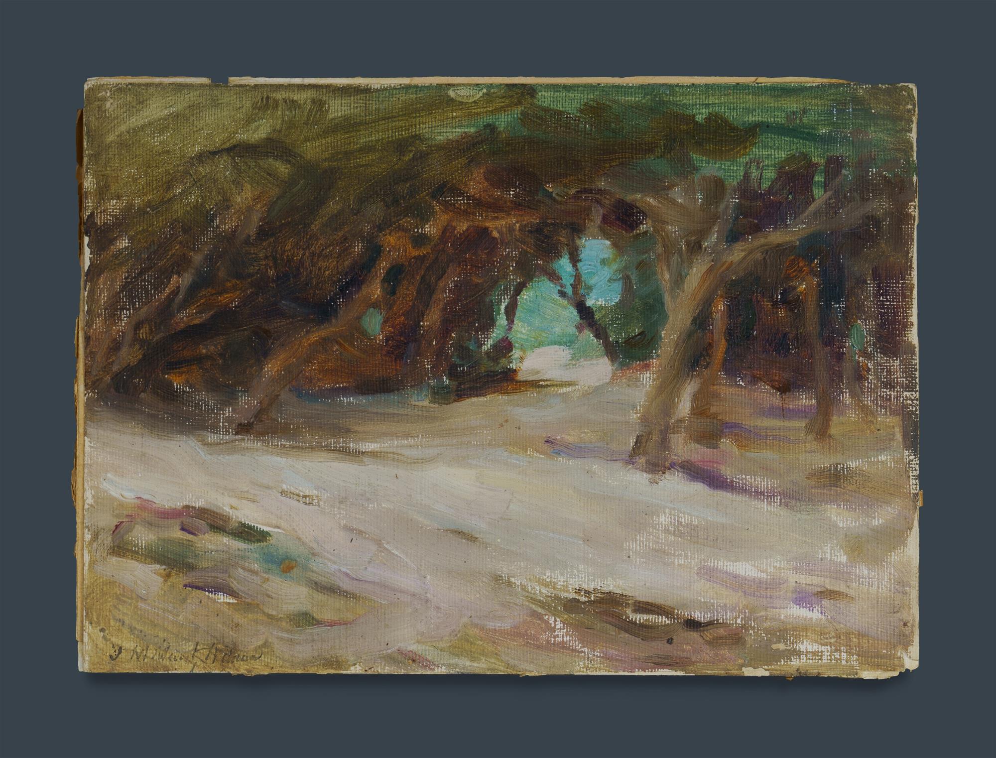Artist Unknown Track Through the Trees Signed indistinctly lower left. Oil on Canvas on Board 17.5x25cmEstimate $80-150