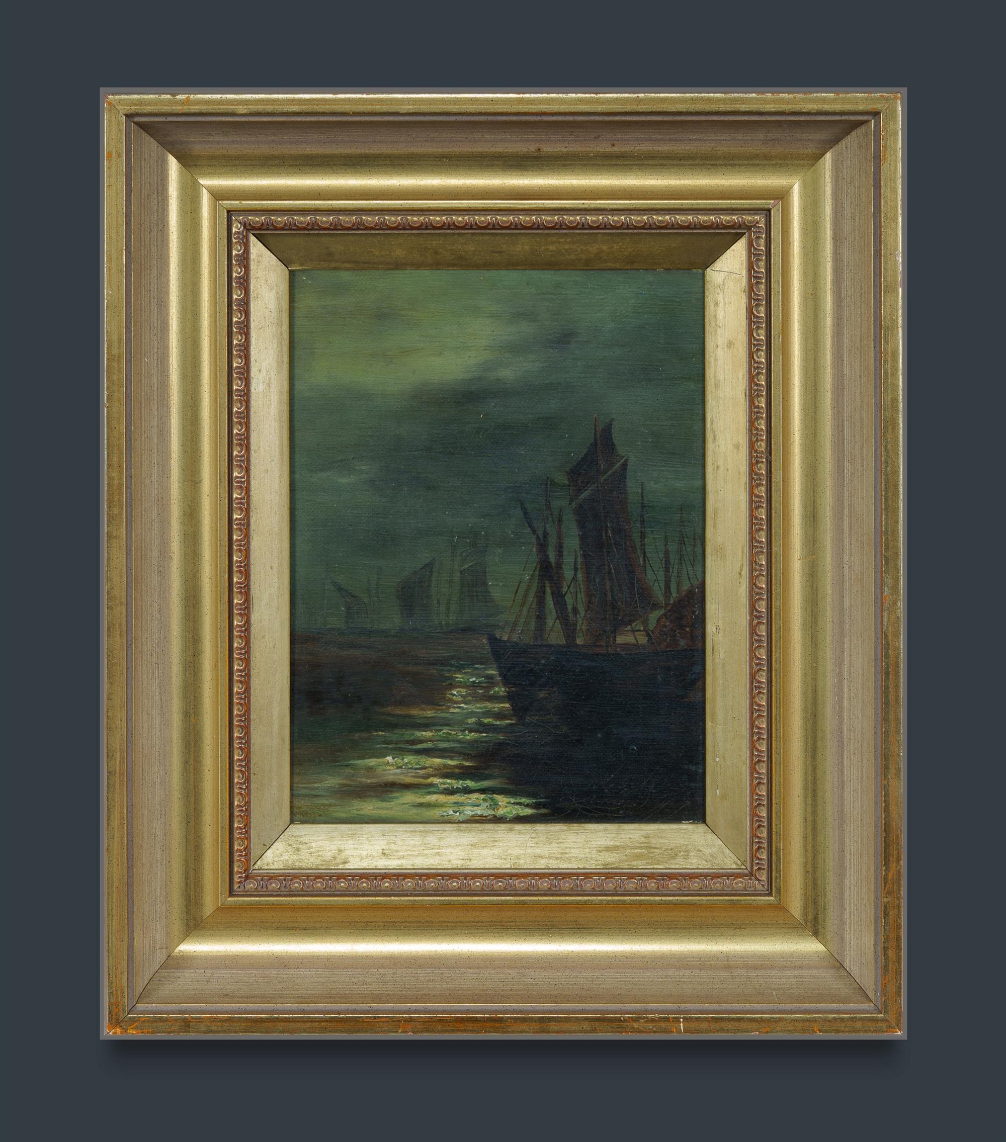 Artist Unknown, likely European Boats at Sea Unsigned but inscribed indistinctly, possibly with signature, verso. Oil on Canvas 22x16.5cmEstimate $80-150