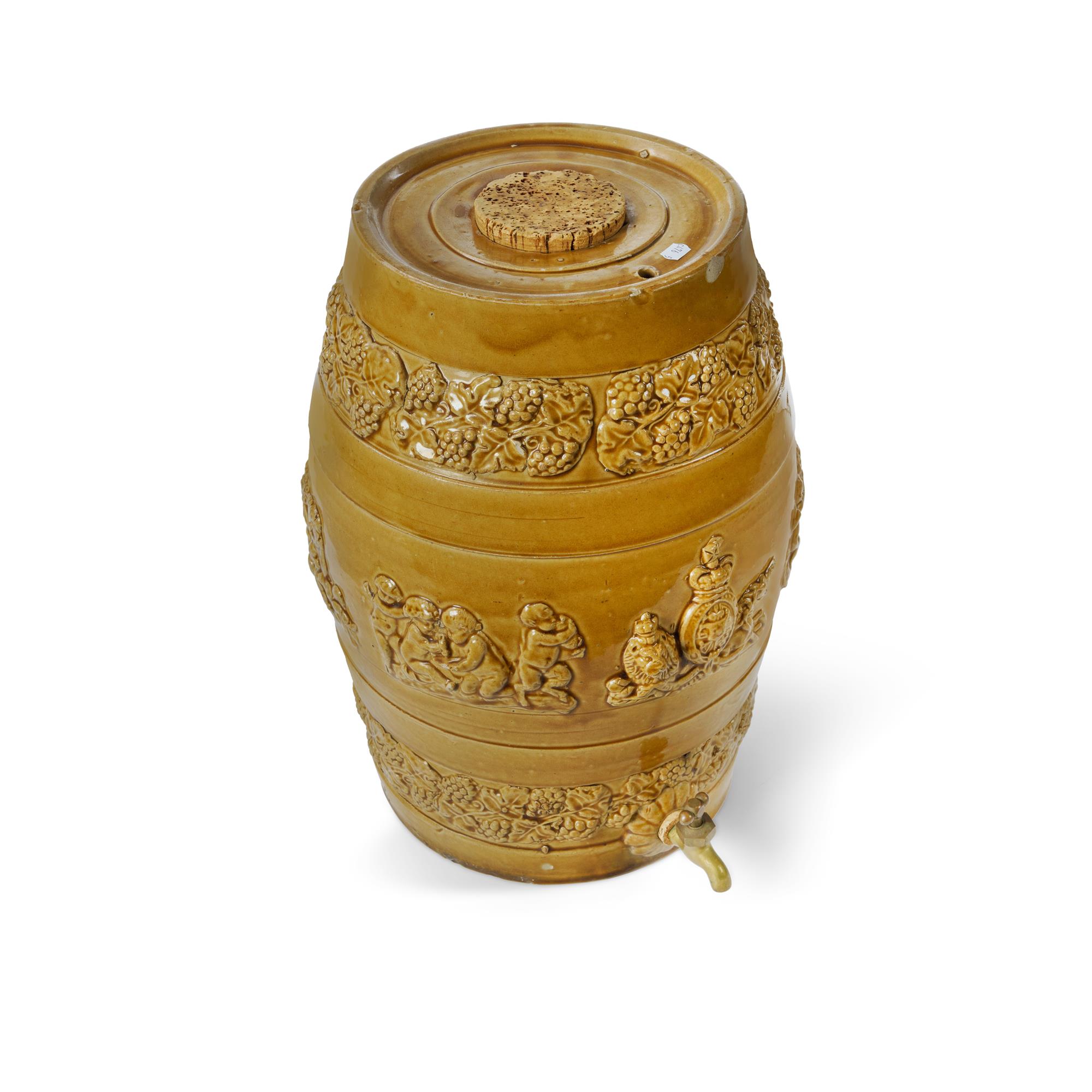 English Stoneware Port Barrel Applied decoration of lion, unicorn, bacchantes, and with bands of fruiting vines. (H40cm)Estimate $100-200