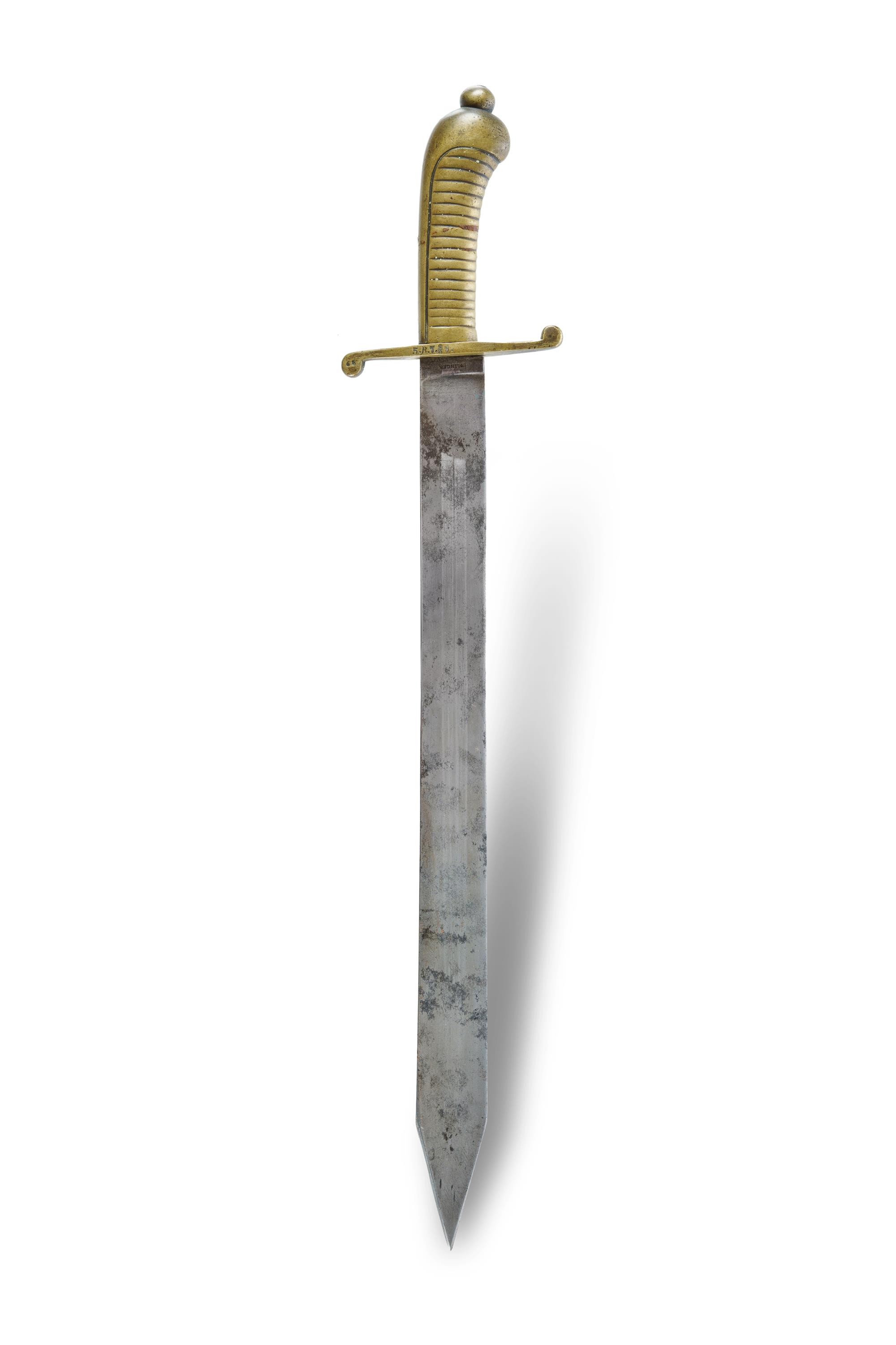 Saxon Model 1840 'Faschinenmesser' Short Sword Weyersberg Kirschbaum & Co. Solingen. Cast brass hilt. Tip reworked into spearpoint. L62.5cm (in scabbard)Estimate $250-450