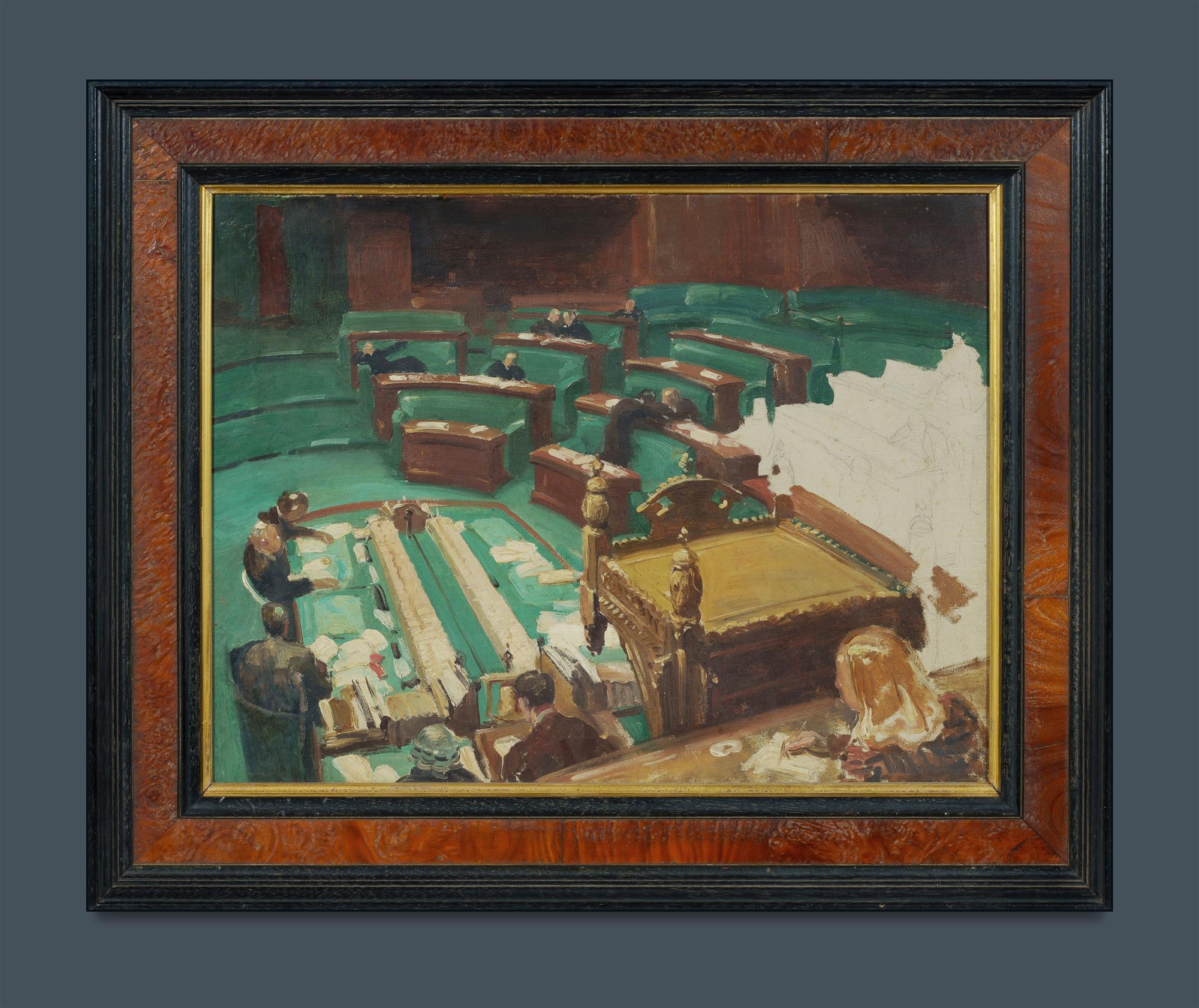 DARGIE, William (1912-2003) House of Representatives Chamber, Parliament House, Canberra. Unsigned and unfinished. Oil on Canvas 37.5x49cm PROVENANCE: The Fred and Elinor Wrobel Collection, Sydney; Estate Late Elinor Wrobel.Estimate $150-300