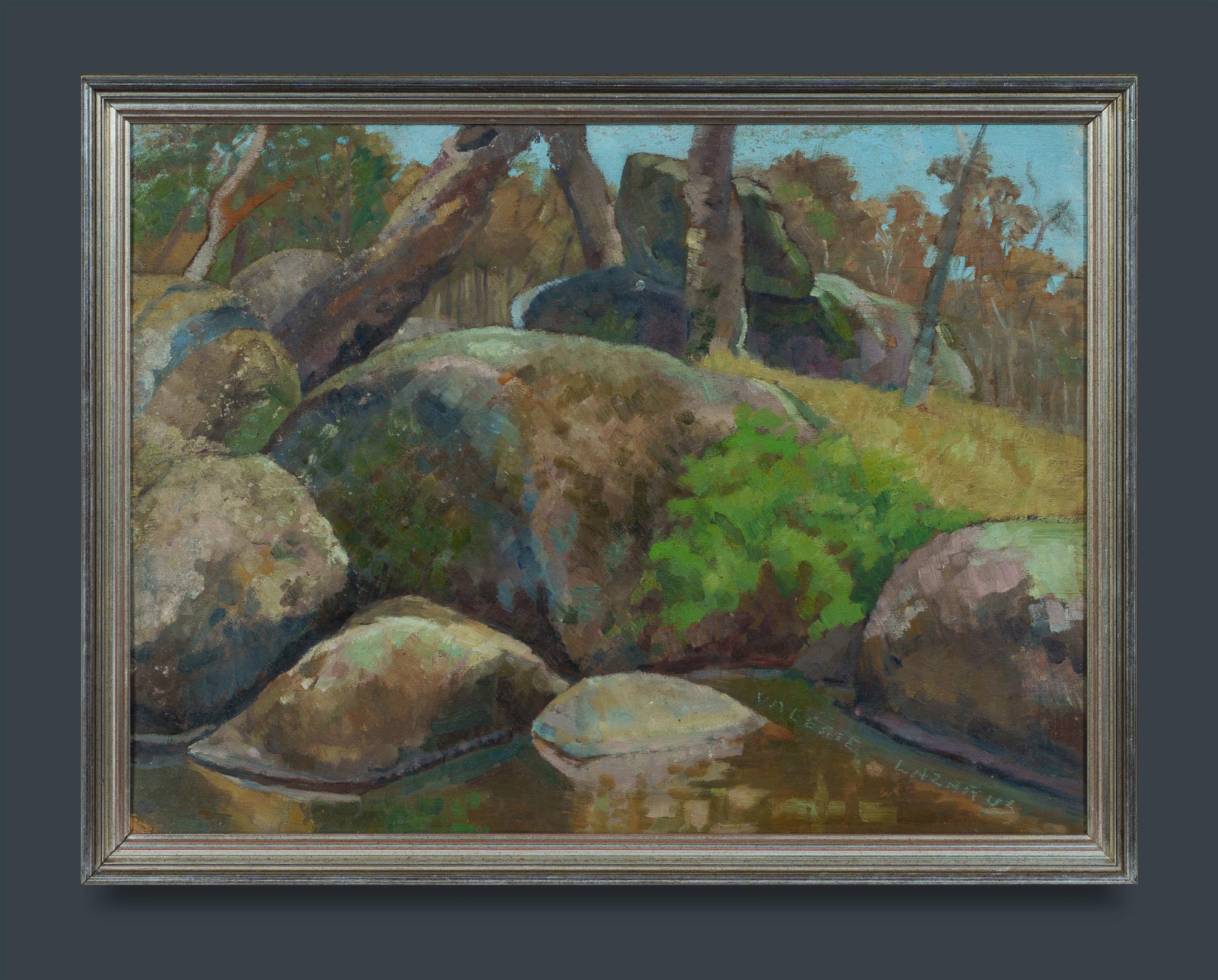 LAZARUS, Valerie (1901-1988) Rocky Landscape Signed lower right. Oil on Board 44x59cm PROVENANCE: The Fred and Elinor Wrobel Collection, Sydney; Estate Late Elinor Wrobel.Estimate $100-200