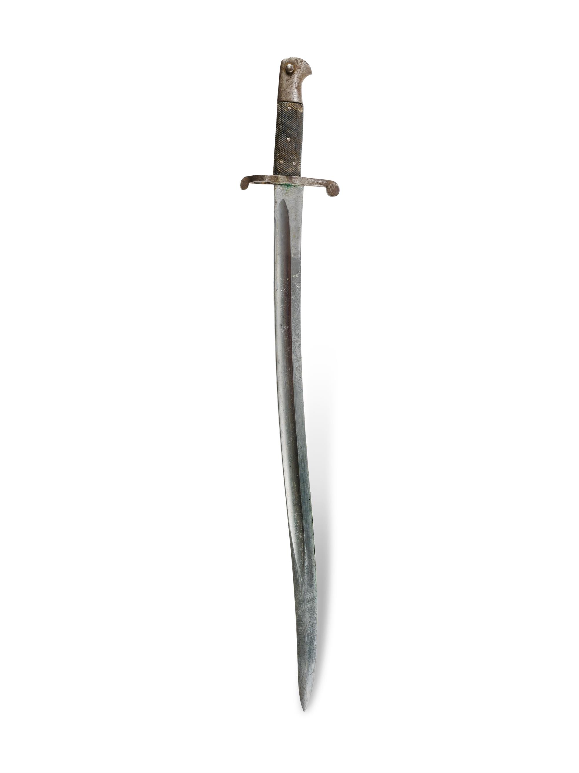 British 1860 Pattern Yatagan Sword Bayonet With leather check grip scales; steel scabbard. (L71cm)Estimate $150-300