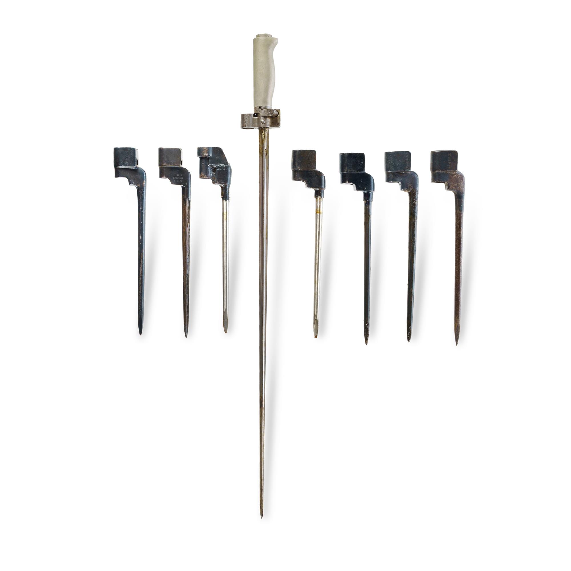 Group of 8 Various Spike Bayonets Includes 7 WWII British No.4 spike bayonets; and French Lebel M1886/93/16 cruciform bayonet.Estimate $100-200