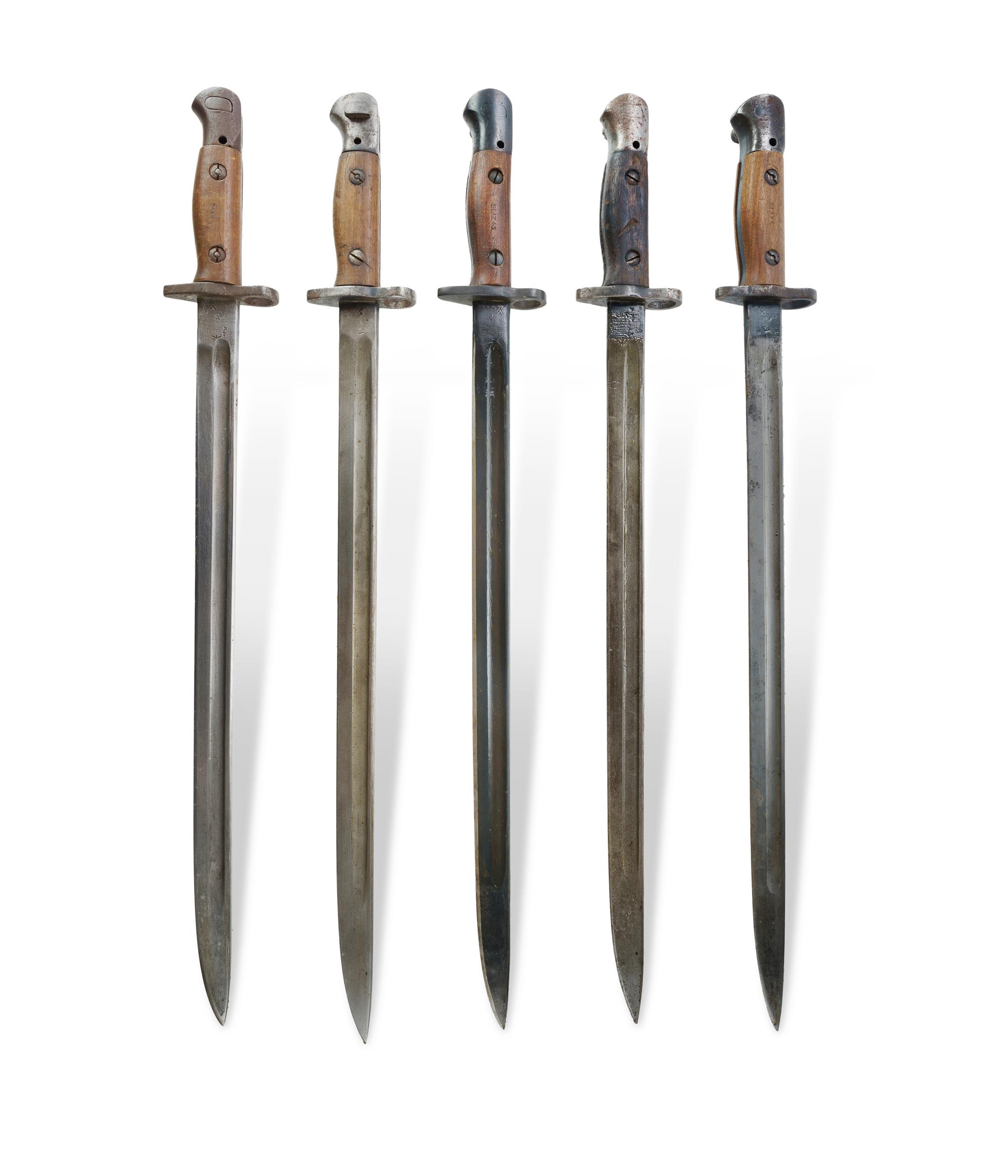 5 Various P1907 Bayonets Makers include Sanderson Bros., Wilkinson, Remington, and Slazenger.Estimate $400-800