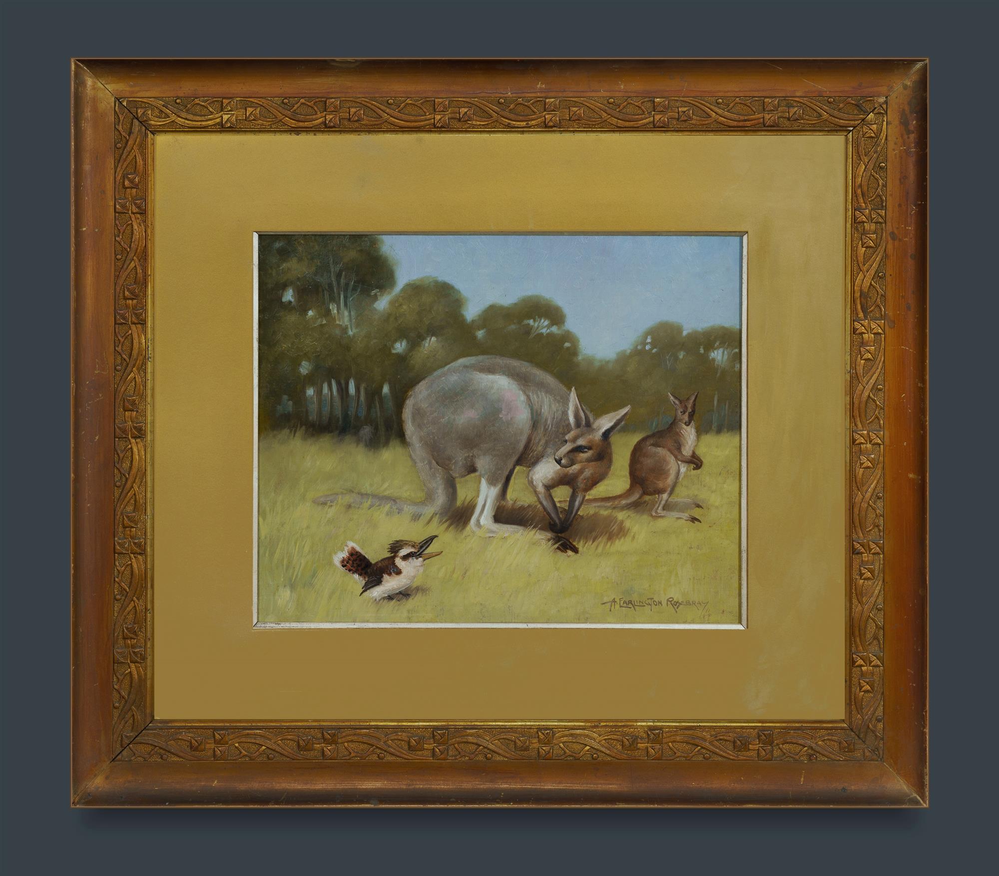 ROSEBRAY, Alvah Earlington (Earlington) (1880-1913) Kangaroos with Kookaburra, 1911. Signed lower right. Oil on Board 36x44.5cm PROVENANCE: The Fred and Elinor Wrobel Collection, Sydney; Estate Late Elinor Wrobel.Estimate $500-800