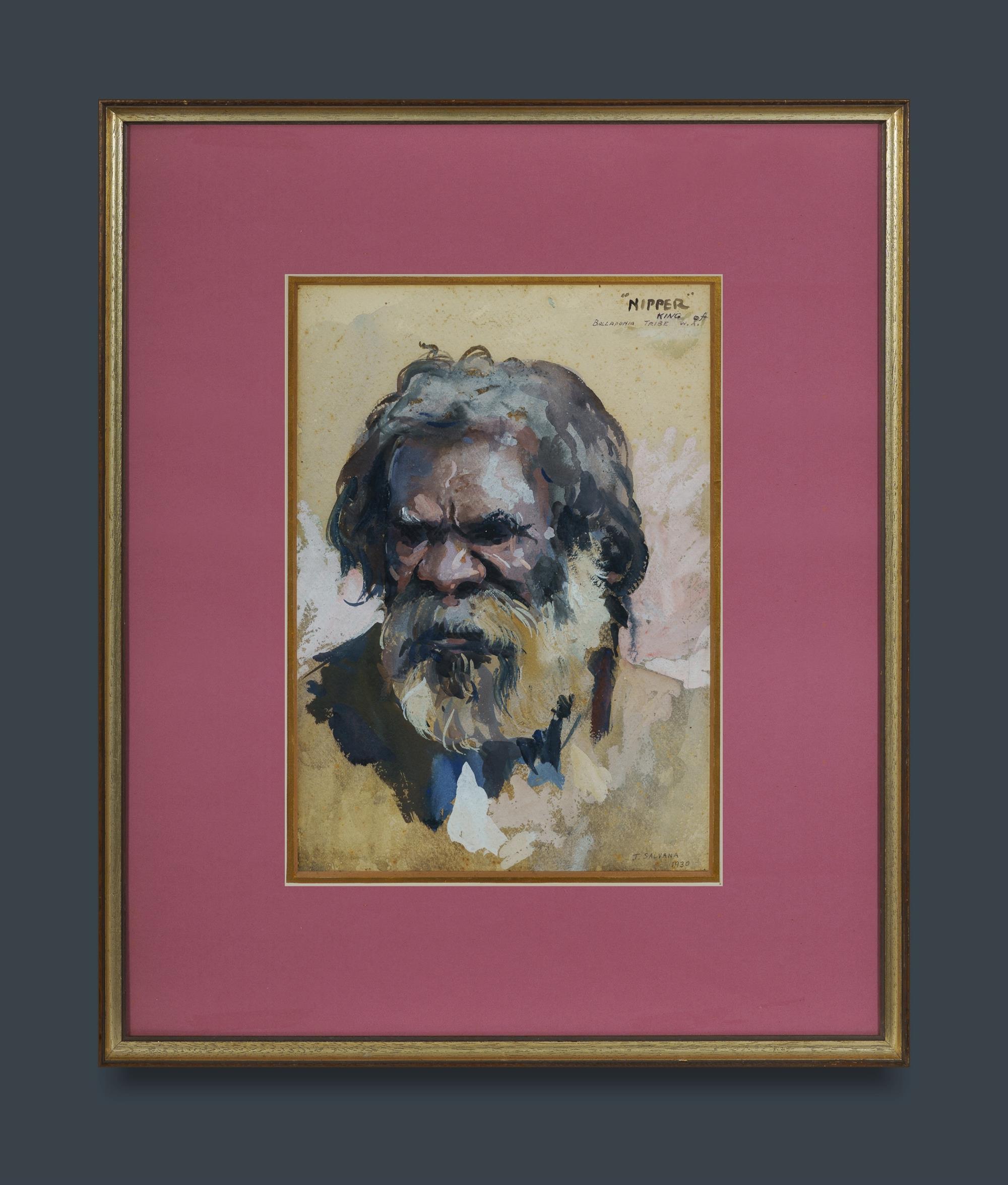 SALVANA, John (Jack) (1873-1956) 'Nipper - King of Balladonia Tribe, WA,' 1930. Signed lower right. W/Clr & Gouache on Paper 38.5x27cm PROVENANCE: The Fred and Elinor Wrobel Collection, Sydney; Estate Late Elinor Wrobel.Estimate $300-500