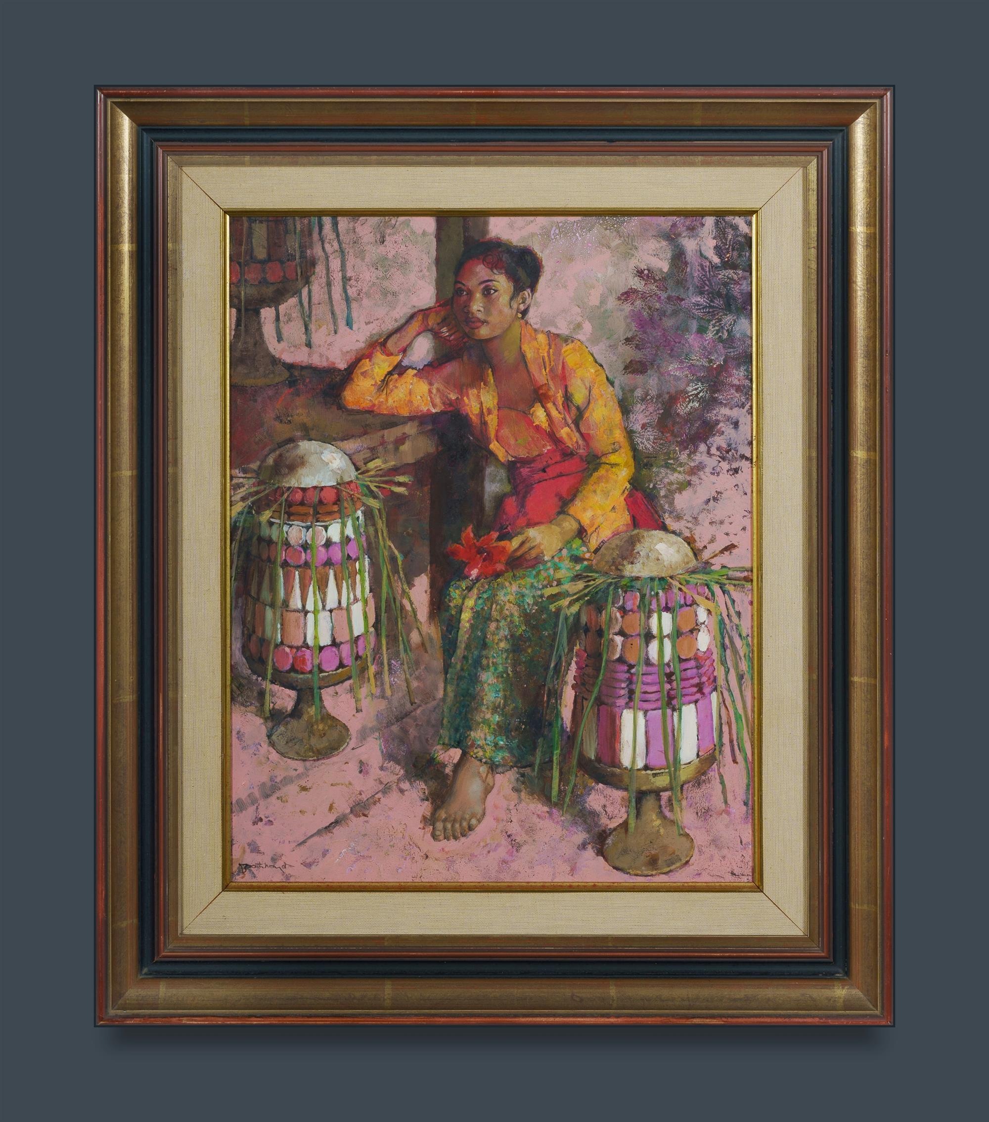 BOOTHROYD, Arthur (1910-2011) Girl with Offerings Signed lower left. Holdsworth Galleries, Sydney, label verso. Oil on Card 46.5x36.5cm PROVENANCE: The Fred and Elinor Wrobel Collection, Sydney; Estate Late Elinor Wrobel.Estimate $150-250