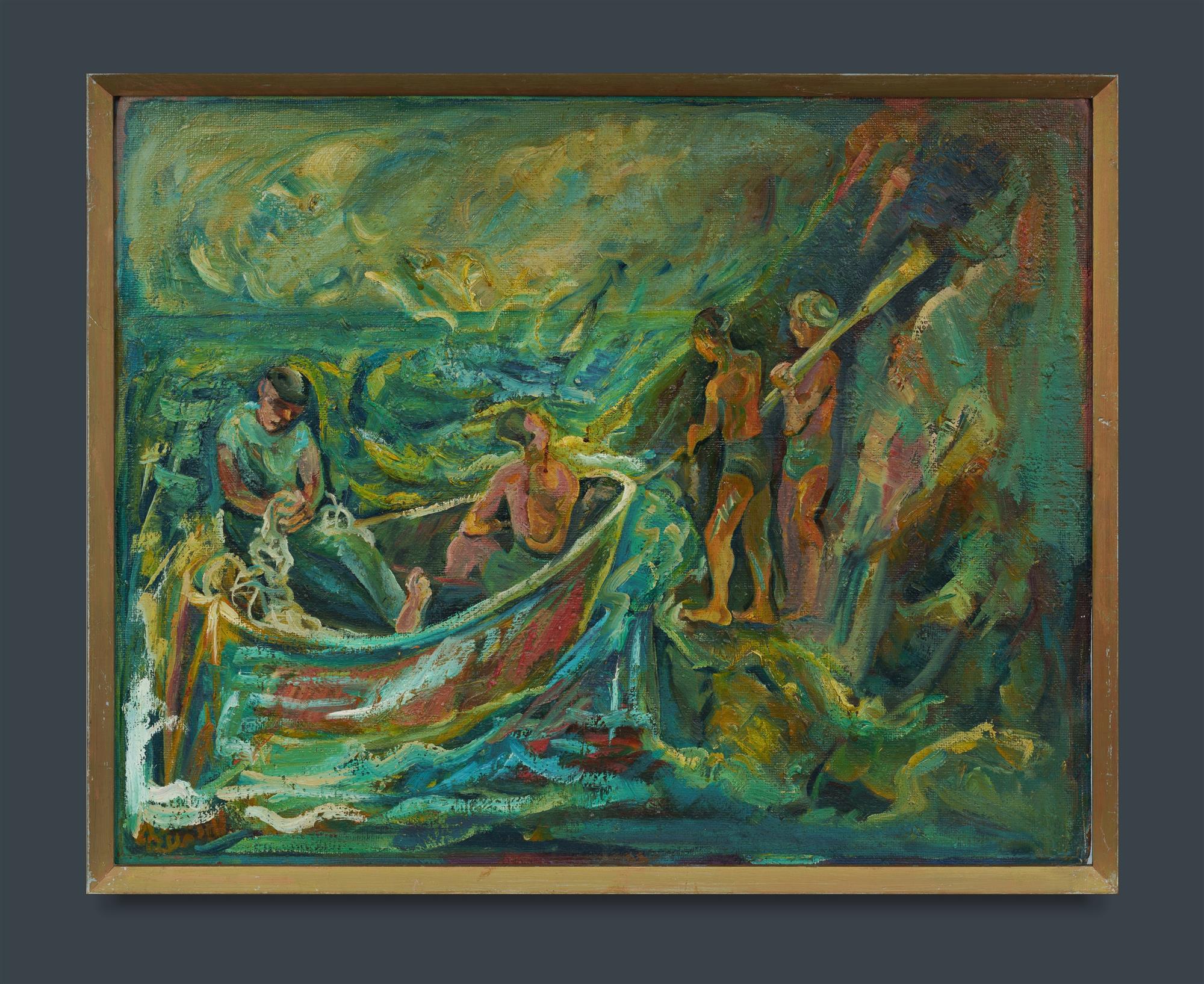 RUSSELL, Elsa (1909-1997) 'The Fishing Party' Signed lower left. Royal Easter Show Art Prize labels verso. Oil on Canvas on Board 59.5x75cm PROVENANCE: The Fred and Elinor Wrobel Collection, Sydney; Estate Late Elinor Wrobel.Estimate $200-400