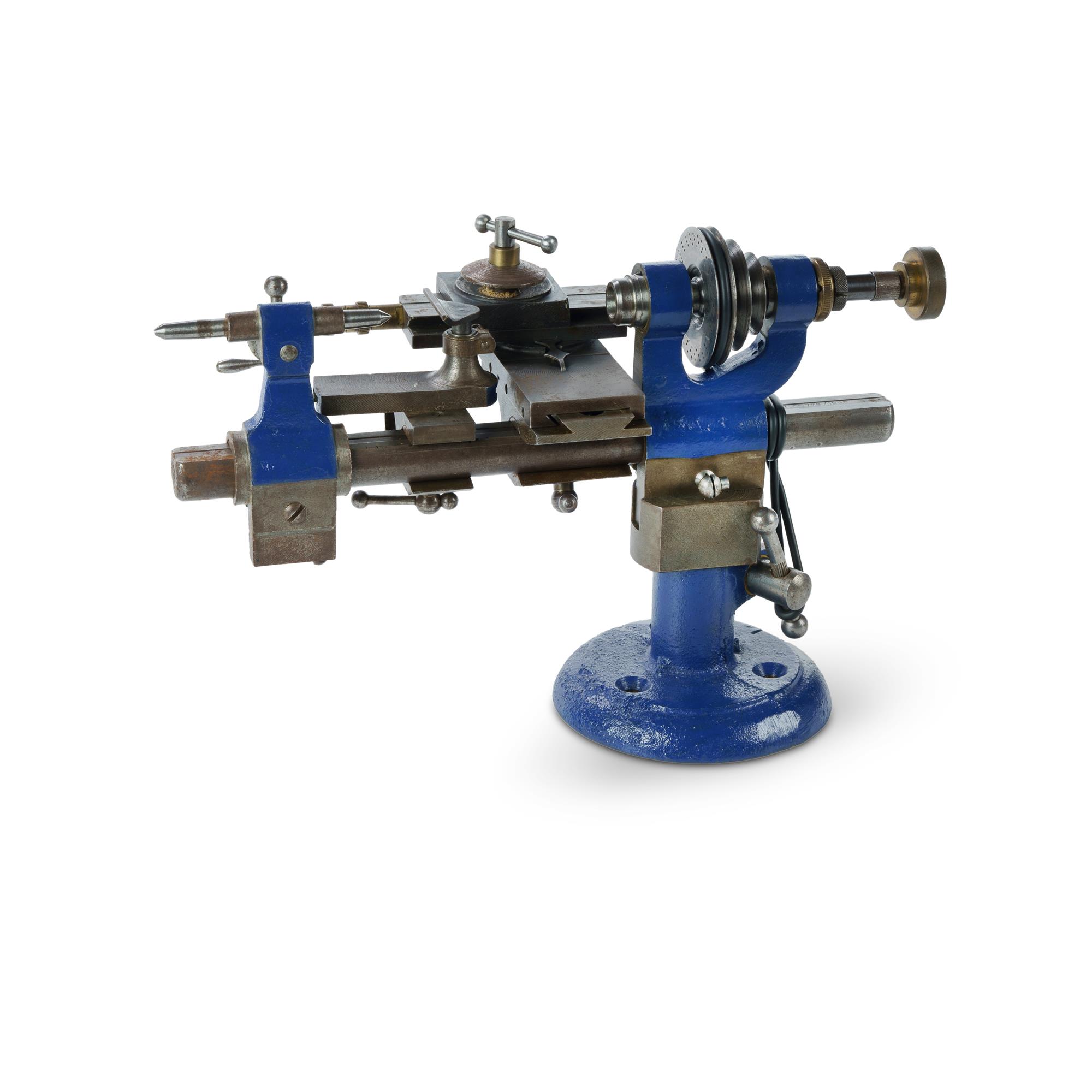 BTM Watchmakers Lathe Boxed British lathe with compound slide and tool rest. Quick mount bench stand. 8mm tube with 1 collet. bearings reasonable. Total bed length 26cm.Estimate $200-400