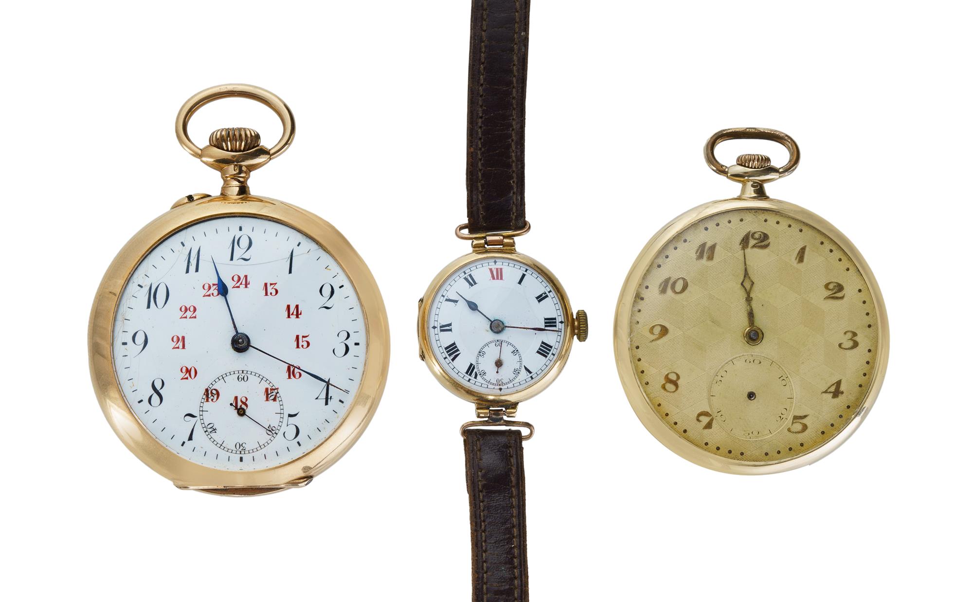 Various Gold Cased Watches Includes boxed open faced pocket watch in 14K double back case, enamel 24hr dial with cracks, Swiss movement running; Swiss pale yellow gold cased pocket watch marked 14K, inner lid marked ‘metal', running, with 2 hands missing; and ladies enamel dial wrist watch with case marked 15K A/F.