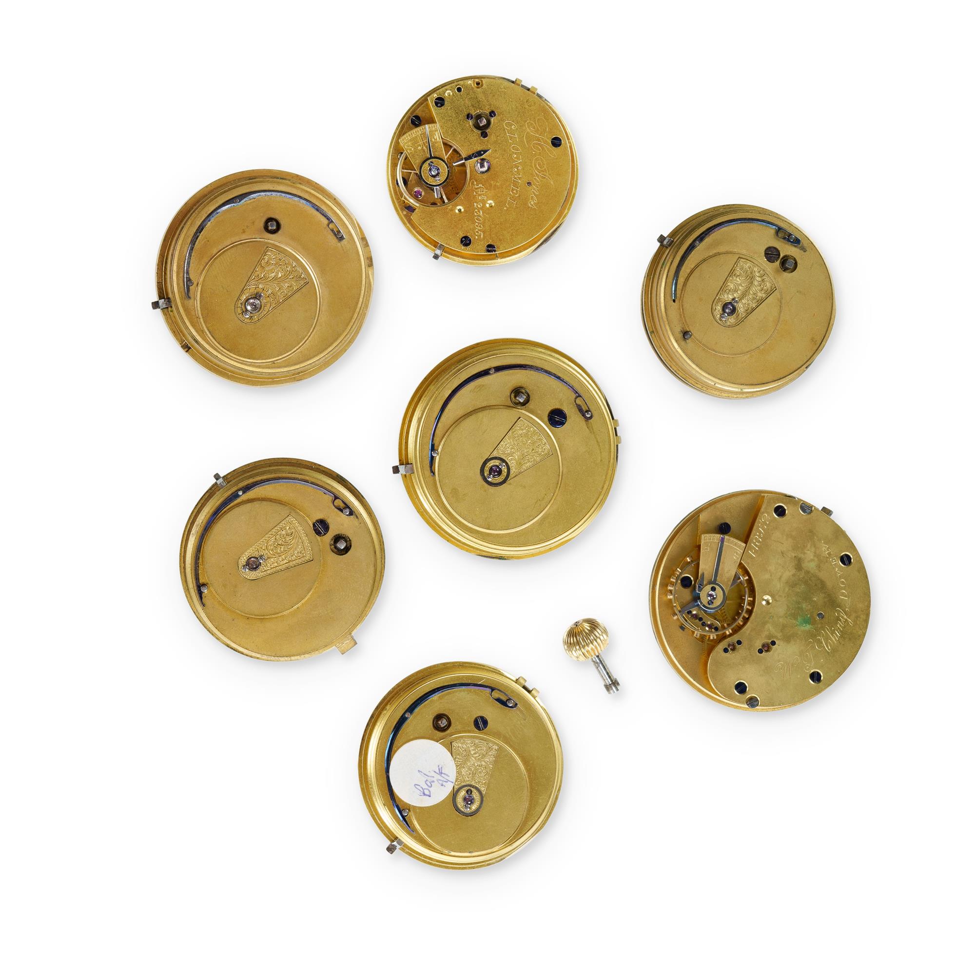 7 Various Older English Movements with Dials Includes Stewart Dawson x2; Gowland; H. Jones, Clonmel; W. Ching, Dover; Hughes, London; Some running.Estimate $100-200