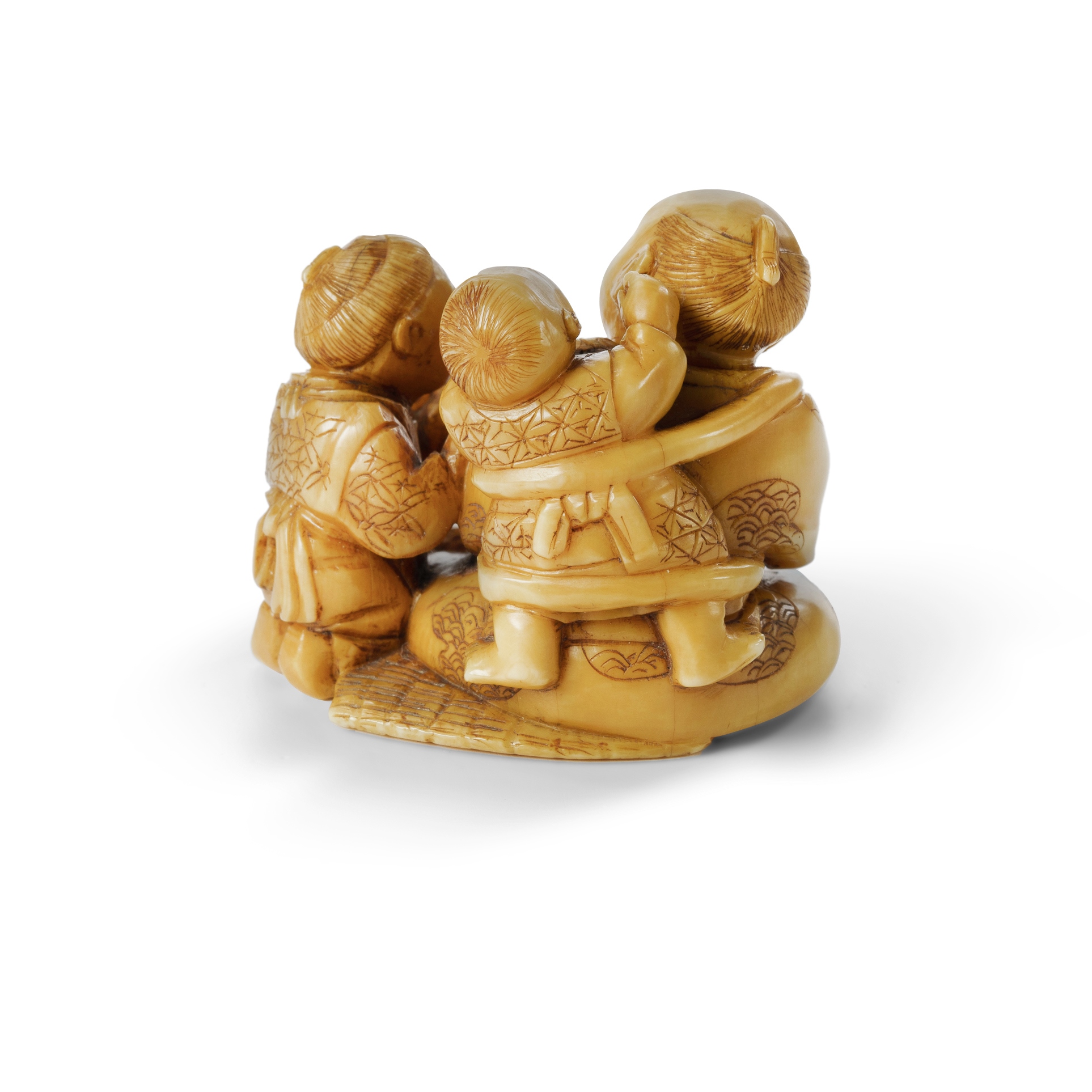 Meiji Period Japanese Ivory Netsuke Depicting a man peeling vegetables, with two young assistants. Signed with inset lacquered plaque. NB: ivory export restrictions. (4x3.5cm)Estimate $250-450