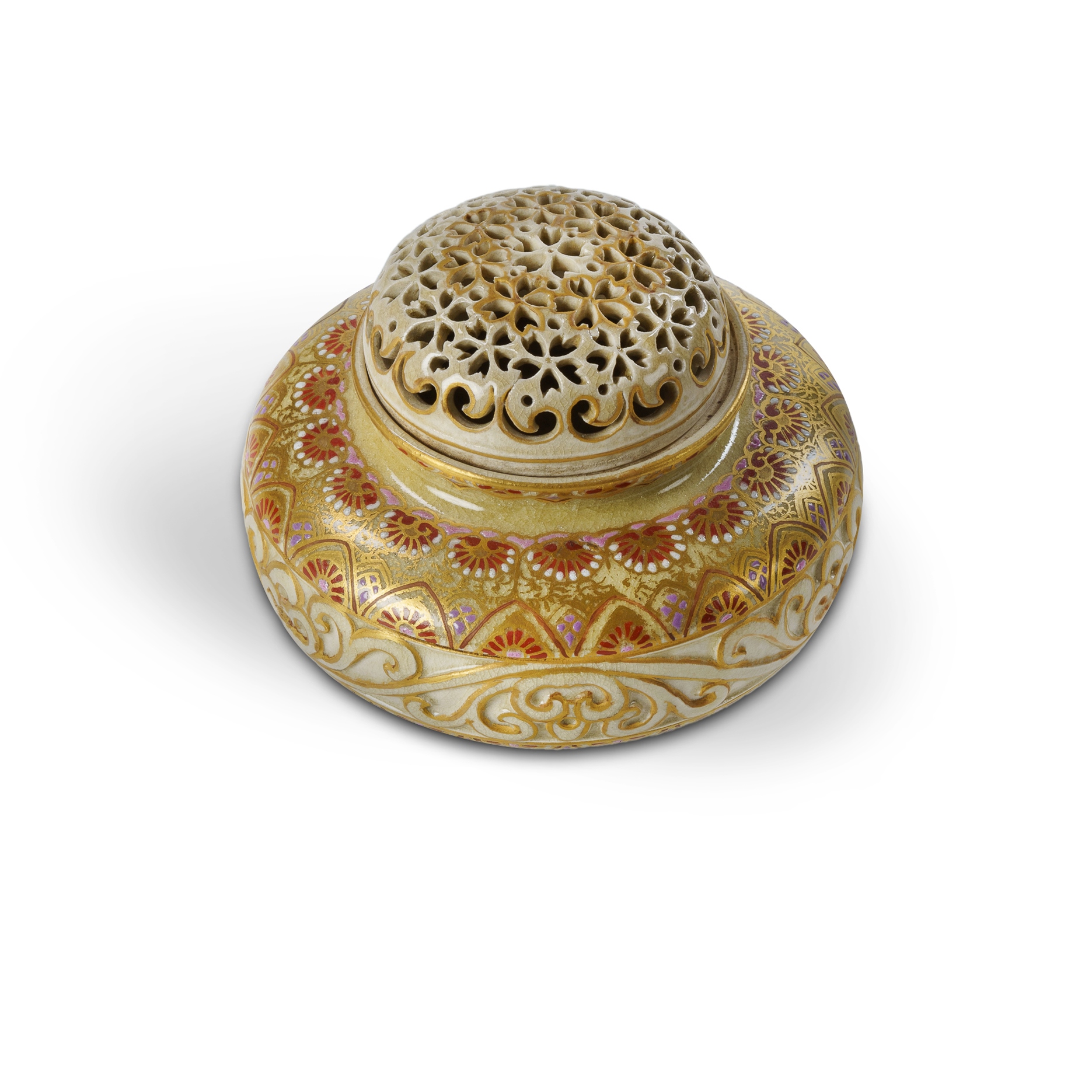 Showa Period Japanese Satsuma Koro With fine reticulated cover. Signed to base. (H7.5cm Dia.10cm)Estimate $80-150