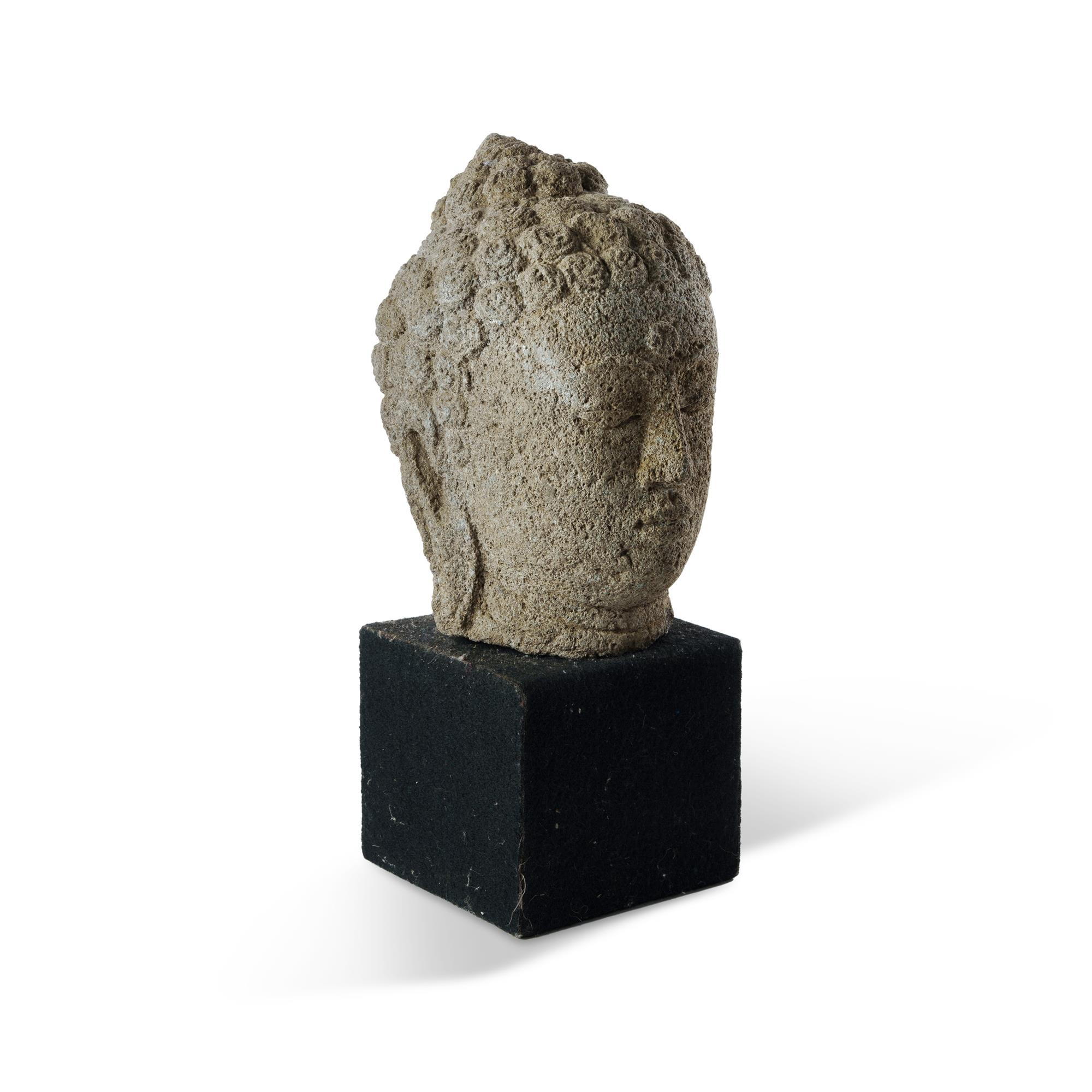Cambodian Khmer Stone Bust of Buddha Serene face with downturned eyes, coiffure of tight curls. H28cm (without base)Estimate $600-800