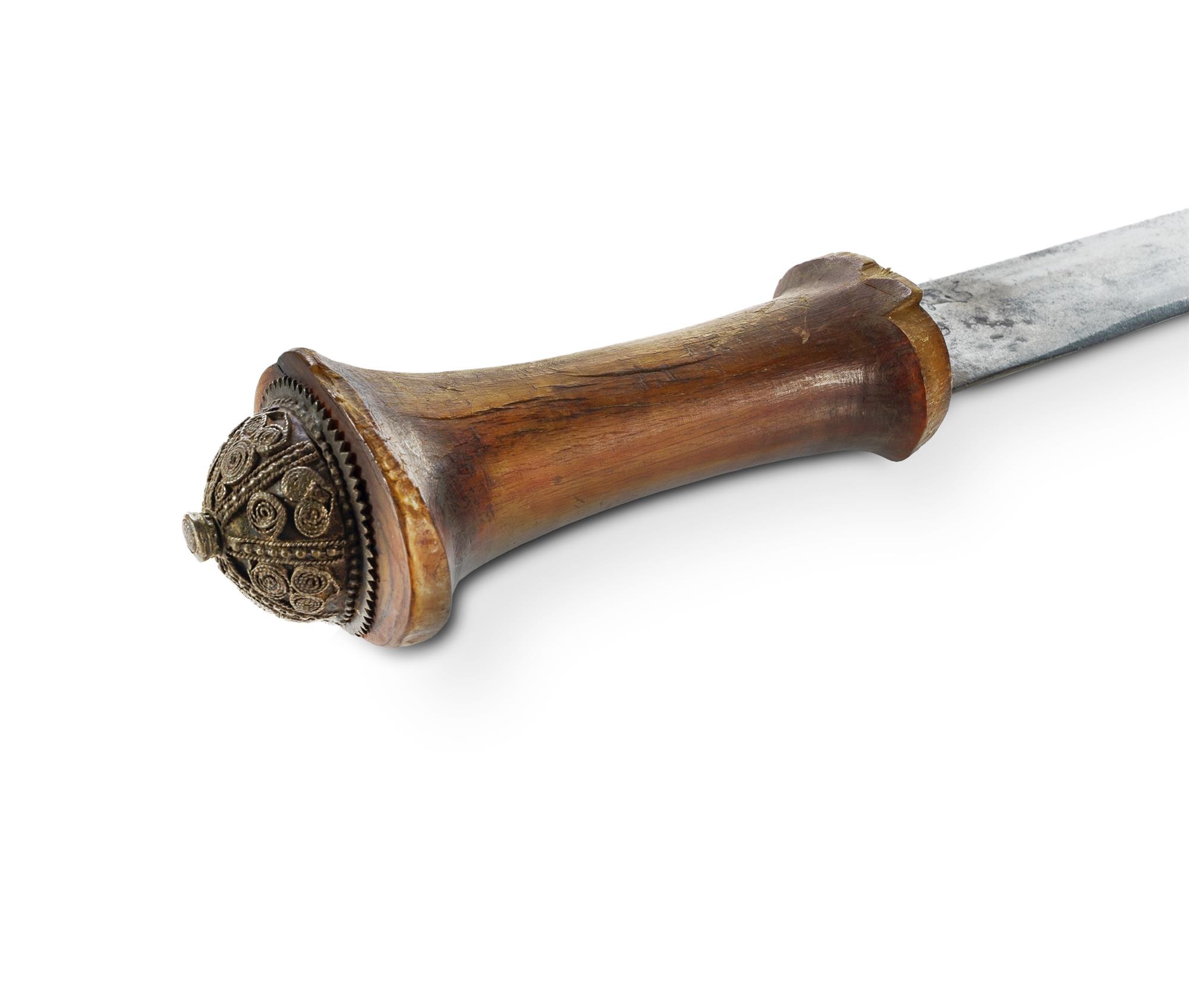 19th C Ethiopian Gurade Sword Solingen blade by W. Clauberg with 'standing knight' maker's mark. Original horn hilt with filigree pommel; tooled leather scabbard. L90cm (total)Estimate $500-1,000