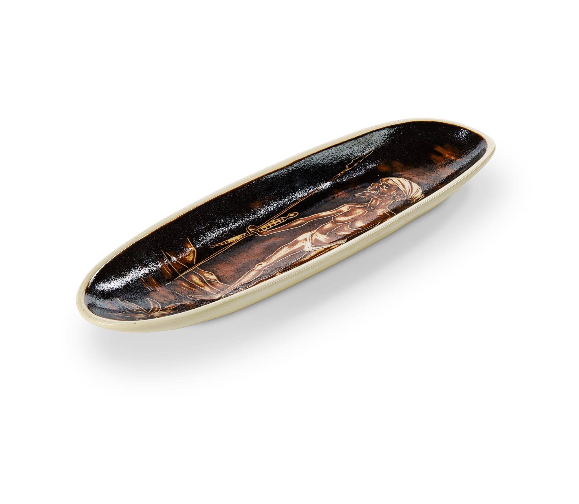 ONUS, Bill (1906-1968) Australian Themed Oval Pottery Dish Decorated with an Aboriginal warrior. Incised signature to base. (L43cm)Estimate $50-80