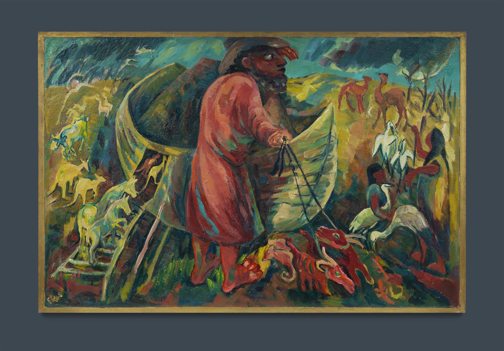 RUSSELL, Elsa Mary (1909-1997) 'Noah Australia' Signed lower left. Oil on Board 61x92cm PROVENANCE: The Fred and Elinor Wrobel Collection, Sydney; Estate Late Elinor Wrobel.Estimate $200-400