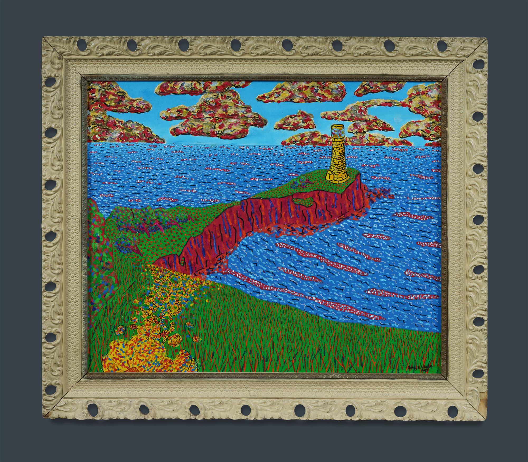 WADE, Doug E. (working 1980s) Coastal Scene with Lighthouse, 1987. Signed lower right. Acrylic & Mixed Media on Canvas on Board 48.5x58cm PROVENANCE: The Fred and Elinor Wrobel Collection, Sydney; Estate Late Elinor Wrobel.Estimate $100-200