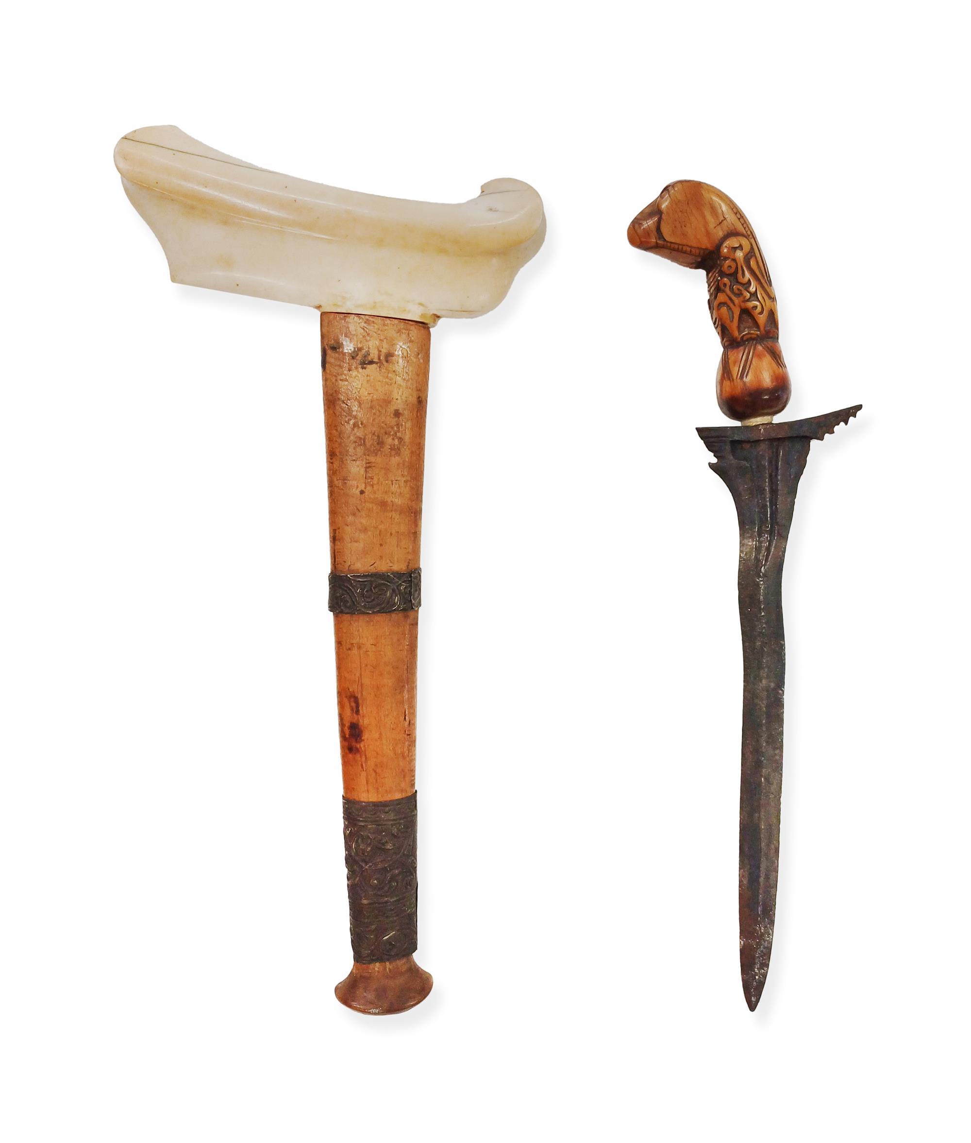 18th/19th C Keris, Jawa Demam Ivory Hilt, Possibly Marine Ivory. Pamor steel blade with single luk (lara sidua). Scabbard with ivory wrangka. NB: ivory export restrictions. L27cm, (19cm blade, hilt 8cm)Estimate $200-400