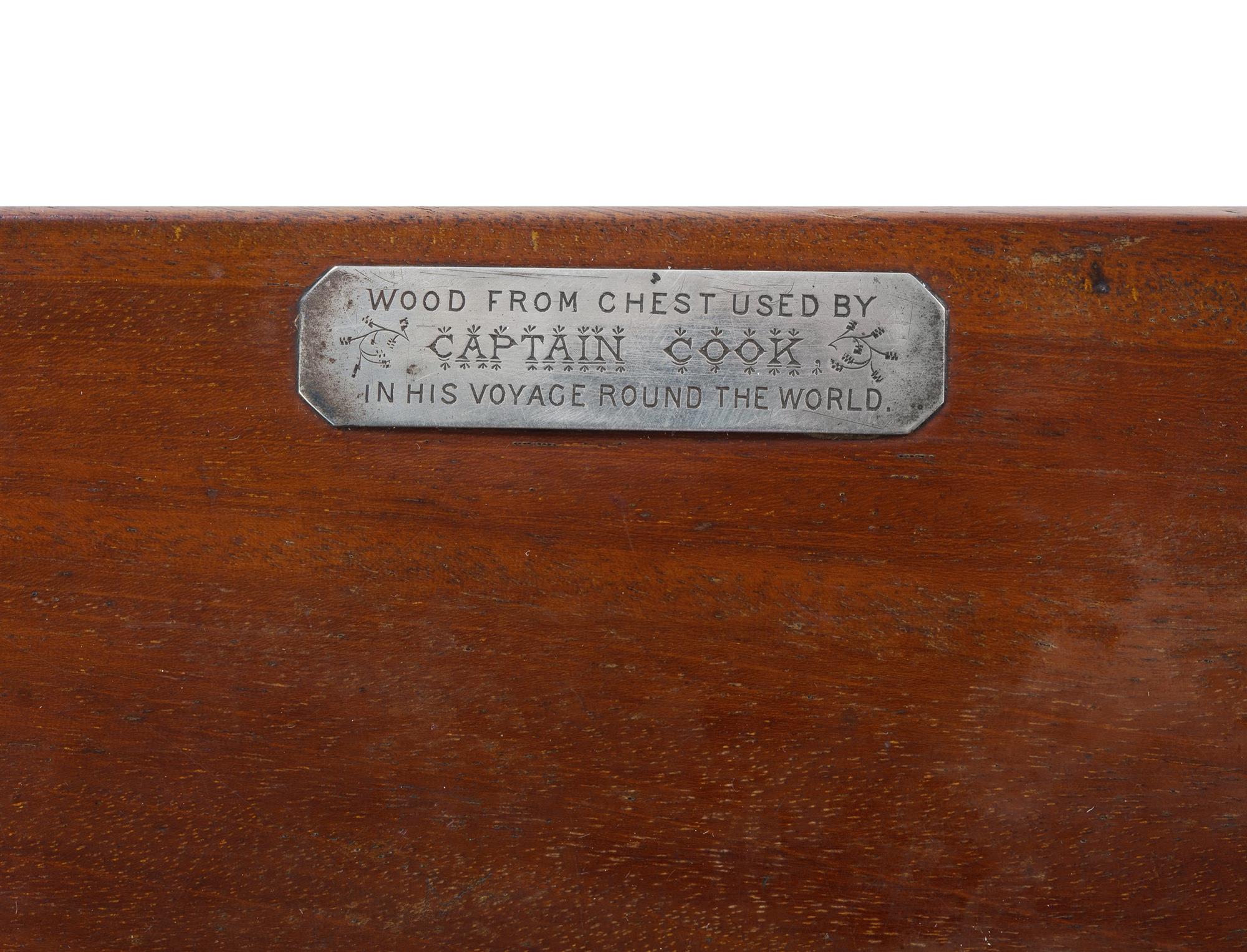 Mahogany Book Stand with Engraved Silver Plaque Inscription reads "wood from chest used by Captain Cook in his voyage around the world" (35x21x9cm)Estimate $100-200