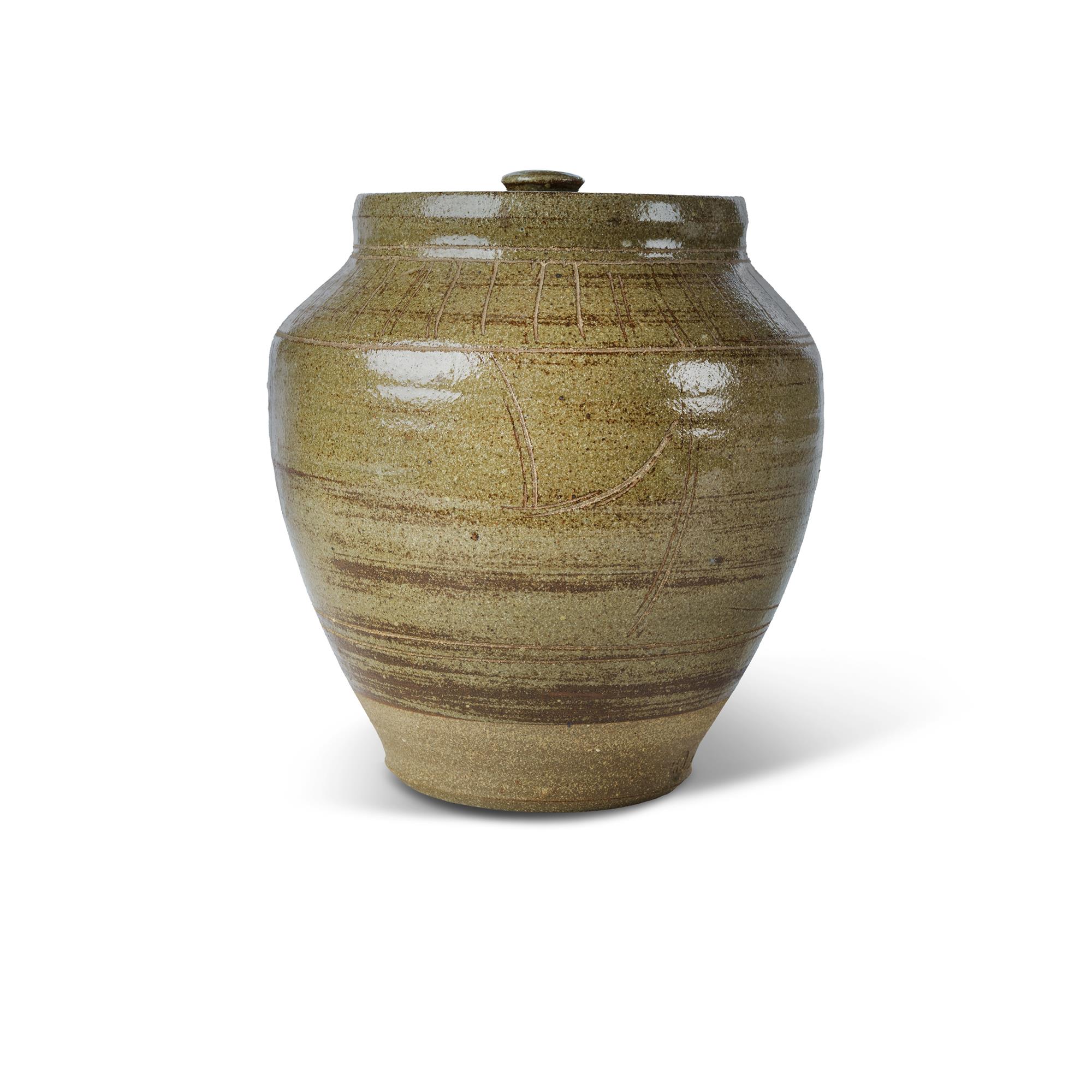 McCONNELL Carl (1926-2003) Stoneware Storage Jar and Lid Incised pattern to body and lid, celadon salt glazed. Impressed seals to foot. (H22cm)Estimate $200-300
