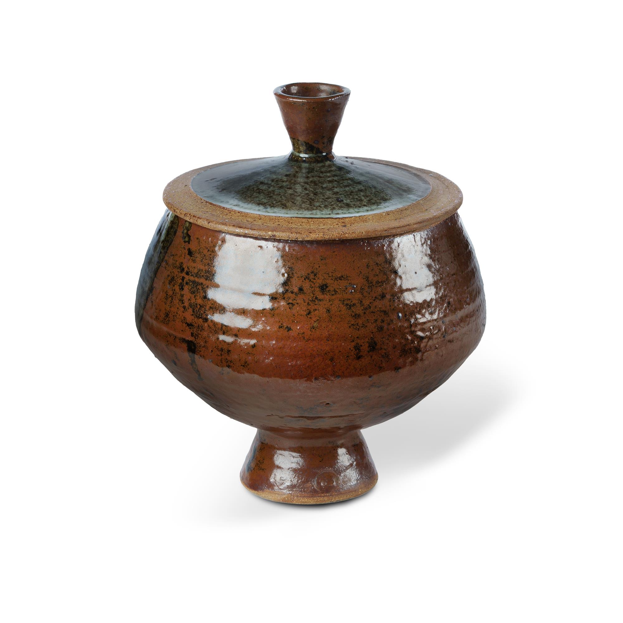 RUSHFORTH Peter (1920-2015) Stoneware Lidded Container, c.1955-65. Raised body over smaller foot. Tenmoku and ash glazed sections with running ash. (H23cm)Estimate $300-500