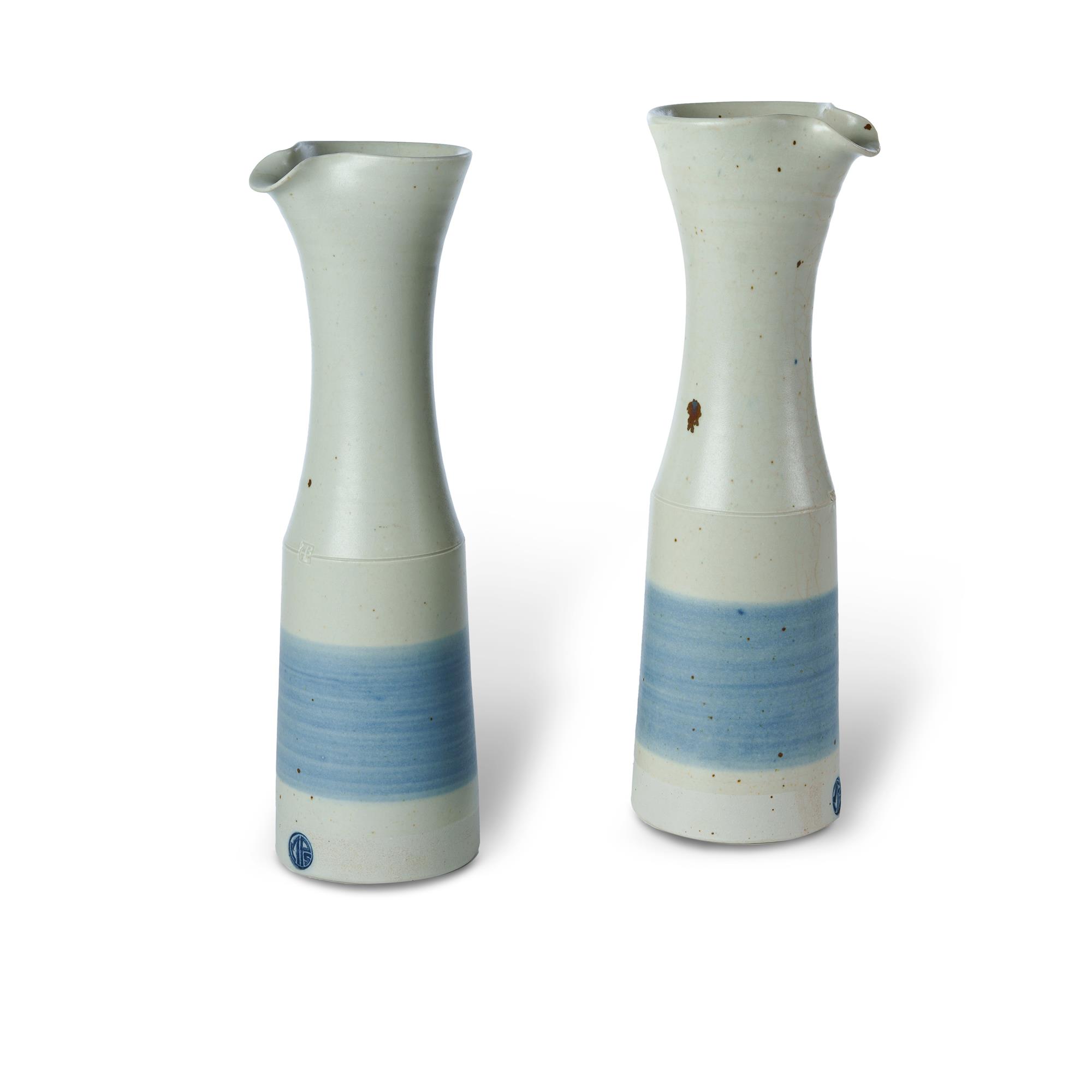 SMITH Derek (1931-2019) Pr White Stoneware Wine Carafes Manganese with iron spot glaze, brushed pale cobalt banding. Impressed seals and monograms for Blackfriars Pottery. (H33cm)Estimate $200-300