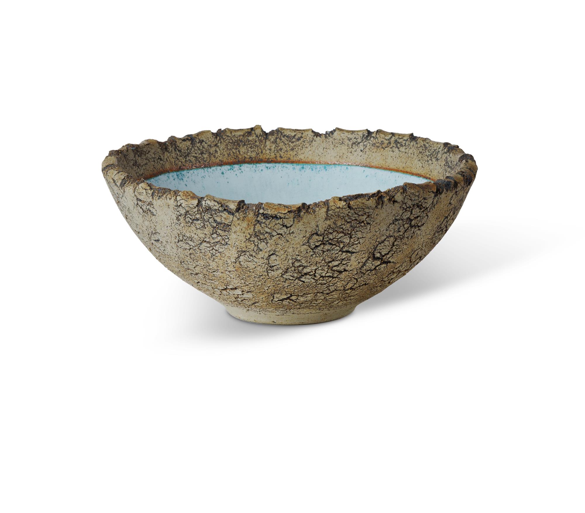 TANTON Rynne (b.1944) Rough Hewn Stoneware Bowl Parched crater form with manganese and cobalt glaze. Incised 'Rynne Tanton' Tasmanian Pottery. (Dia.26cm)Estimate $80-120