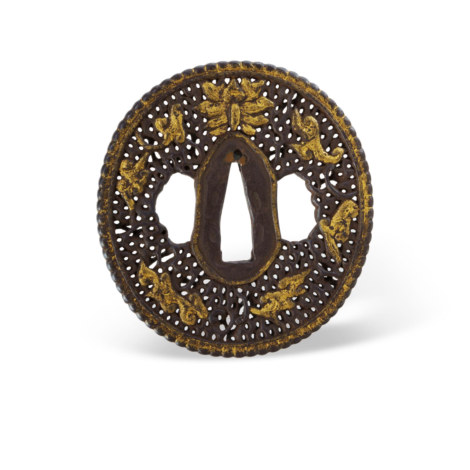 Japanese 18th C Iron Nanban Tsuba Naga maru gata form, with pierced and gilt decoration. (7.2x6.5cm)Estimate $350-550
