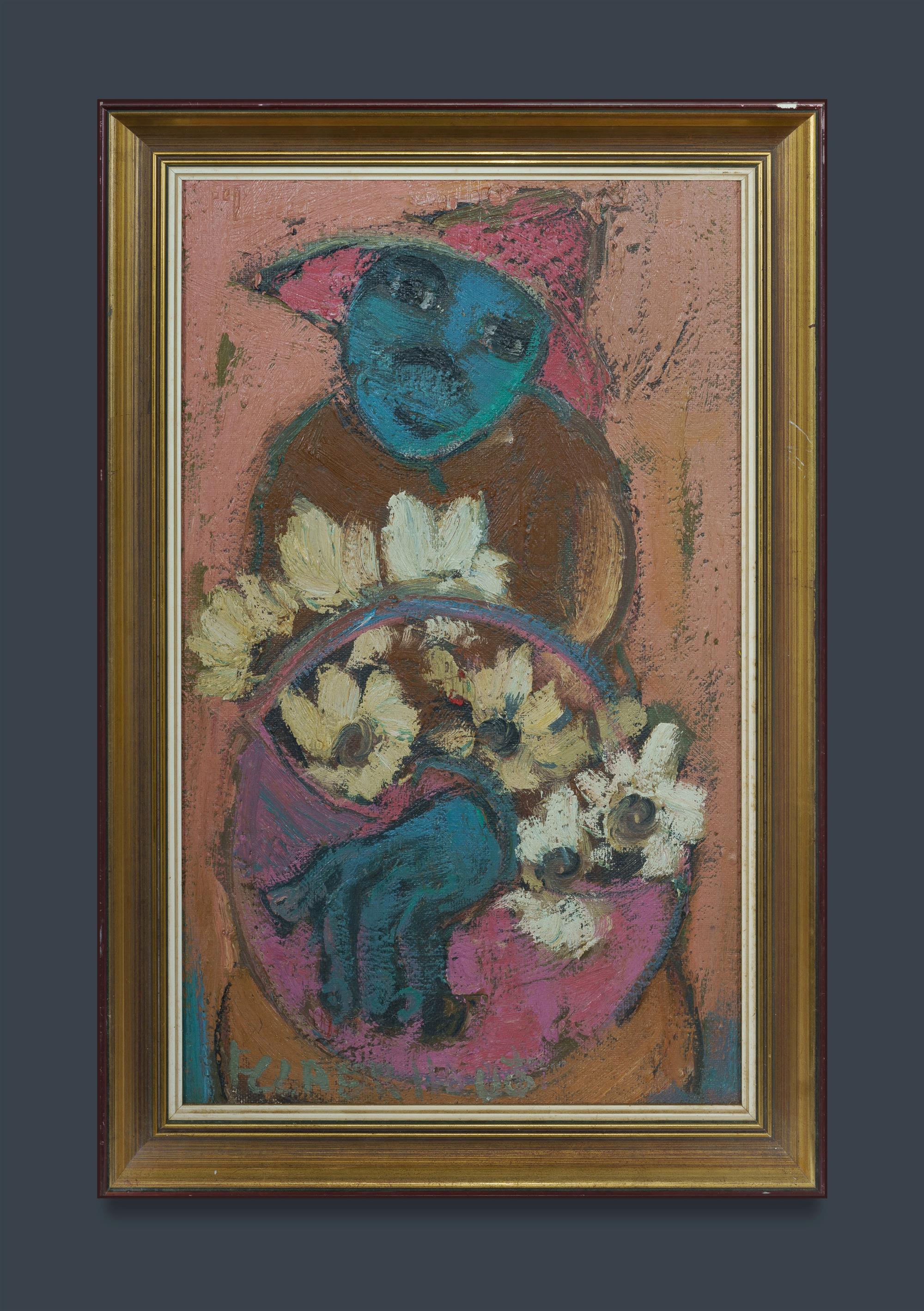 CLAERHOUT, Frans (South African 1919-2006) 'Woman with Basket of Flowers' Remnants of Pretoria Art Museum label verso. Oil on Canvas on Board 55x33.5cmEstimate $300-500