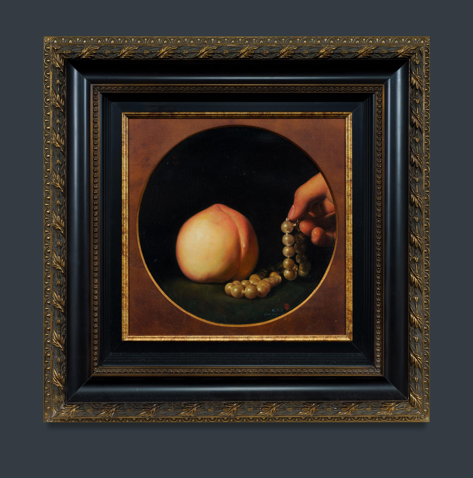 CHEN, Chengwei (Chinese b.1984) Still Life with Peach and String of Pearls Signed lower right and with thumbprint. Oil on Canvas Dia.34cm PROVENANCE: The artist; private collection, China and Sydney (purchased directly from the above); thence by descent (deceased estate)Estimate $1,000-2,000