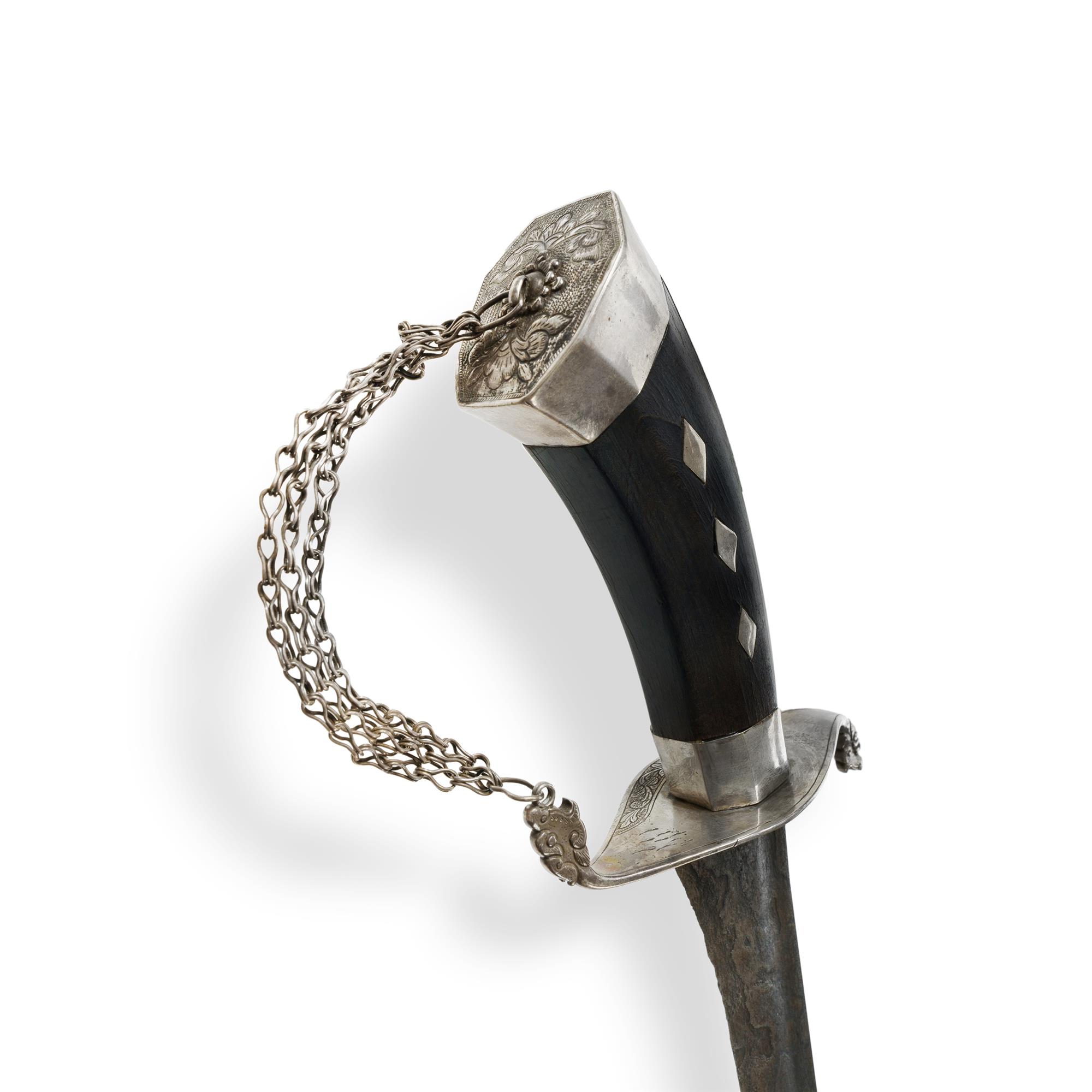 Indonesian 'Pedang Lurus' Gently curved pamor blade; the hilt and scabbard silver mounted on ebony. L50cm (blade) L62cm (total) PROVENANCE: From the collection of the late Warren MallardEstimate $300-600