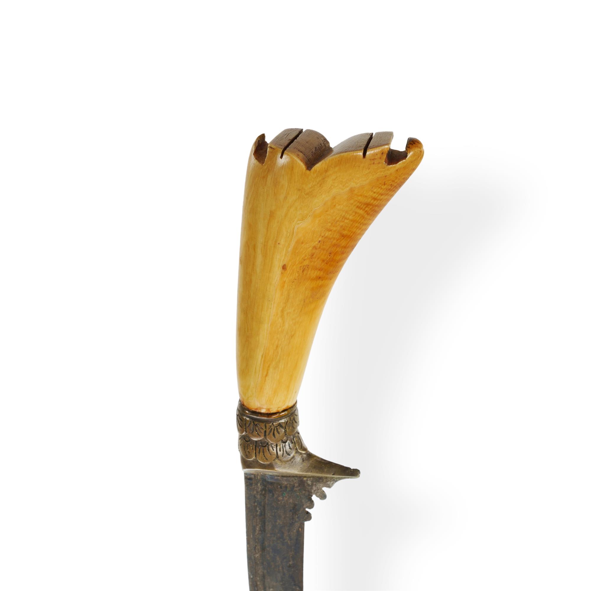 Early 20th C Sulawesi Badik Knife Traditional single edged, forward curved pamor blade; ivory hilt. NB: ivory export restrictions. (L38.5cm) PROVENANCE: From the collection of the late Warren MallardEstimate $150-250