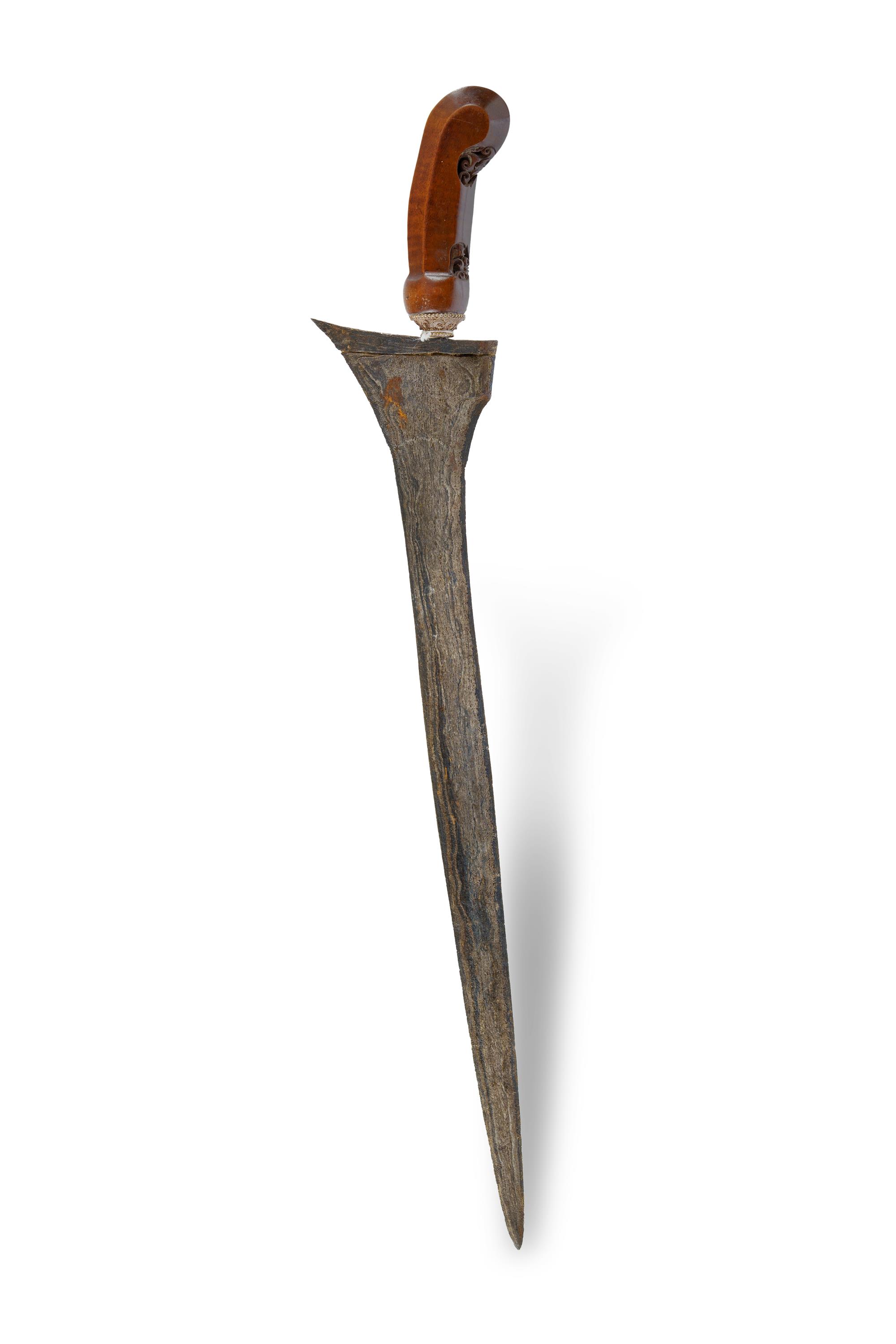 Balinese Keris With straight pamor blade; gold mendak and solo hilt; scabbard with repousse brass sheath. L49cm (total) PROVENANCE: From the collection of the late Warren MallardEstimate $200-400
