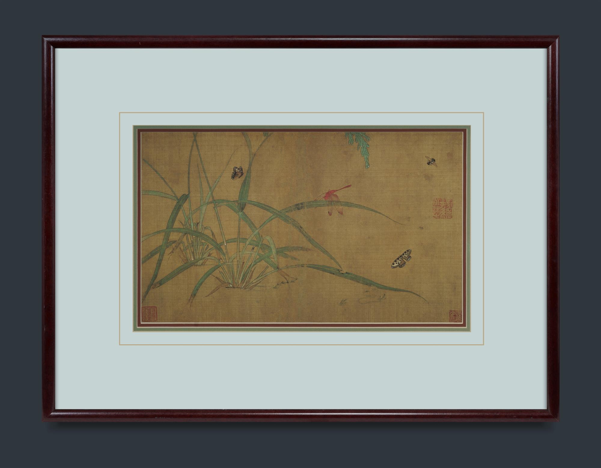 Chinese School Dragonfly and Butterflies in the Grasses Ink & Colour on Silk 26x45cmEstimate $80-150