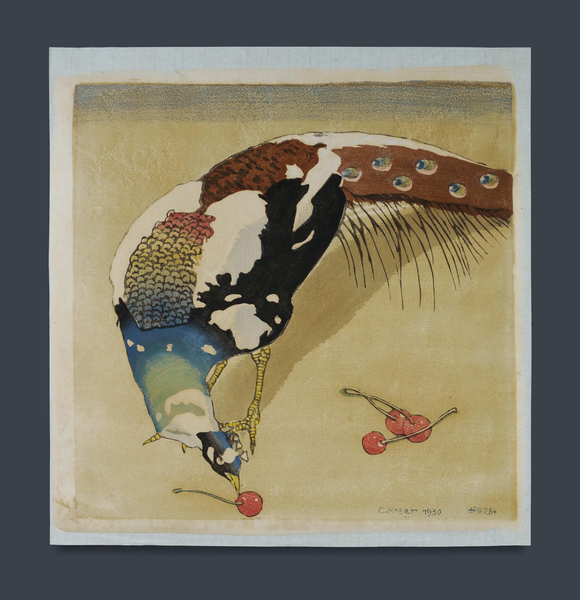 MOSER, Carl (Austrian 1873-1939) 'White-Spotted Peacock,' 1930. Woodcut on Japanese Tissue Paper 37x37.5cm (image)