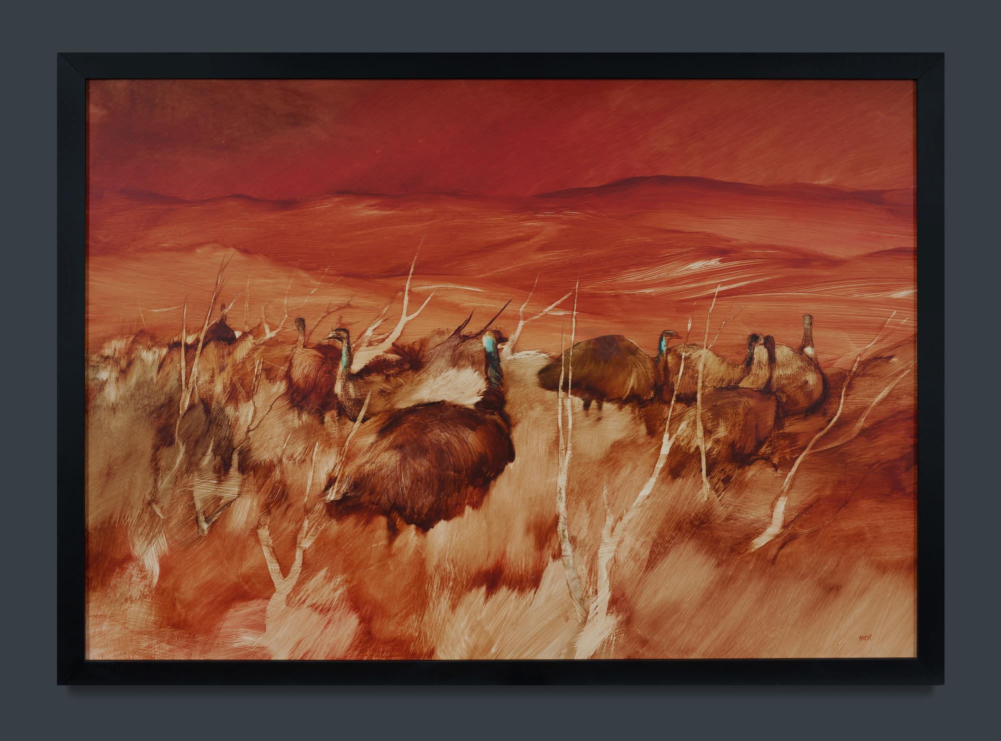 HICK, Jacqueline (1914-2004) 'Red Hill Emus' Signed lower right. Also inscribed verso with title and 'Rose Park Gallery' Oil on Board 59.5x85cmEstimate $1,000-2,000