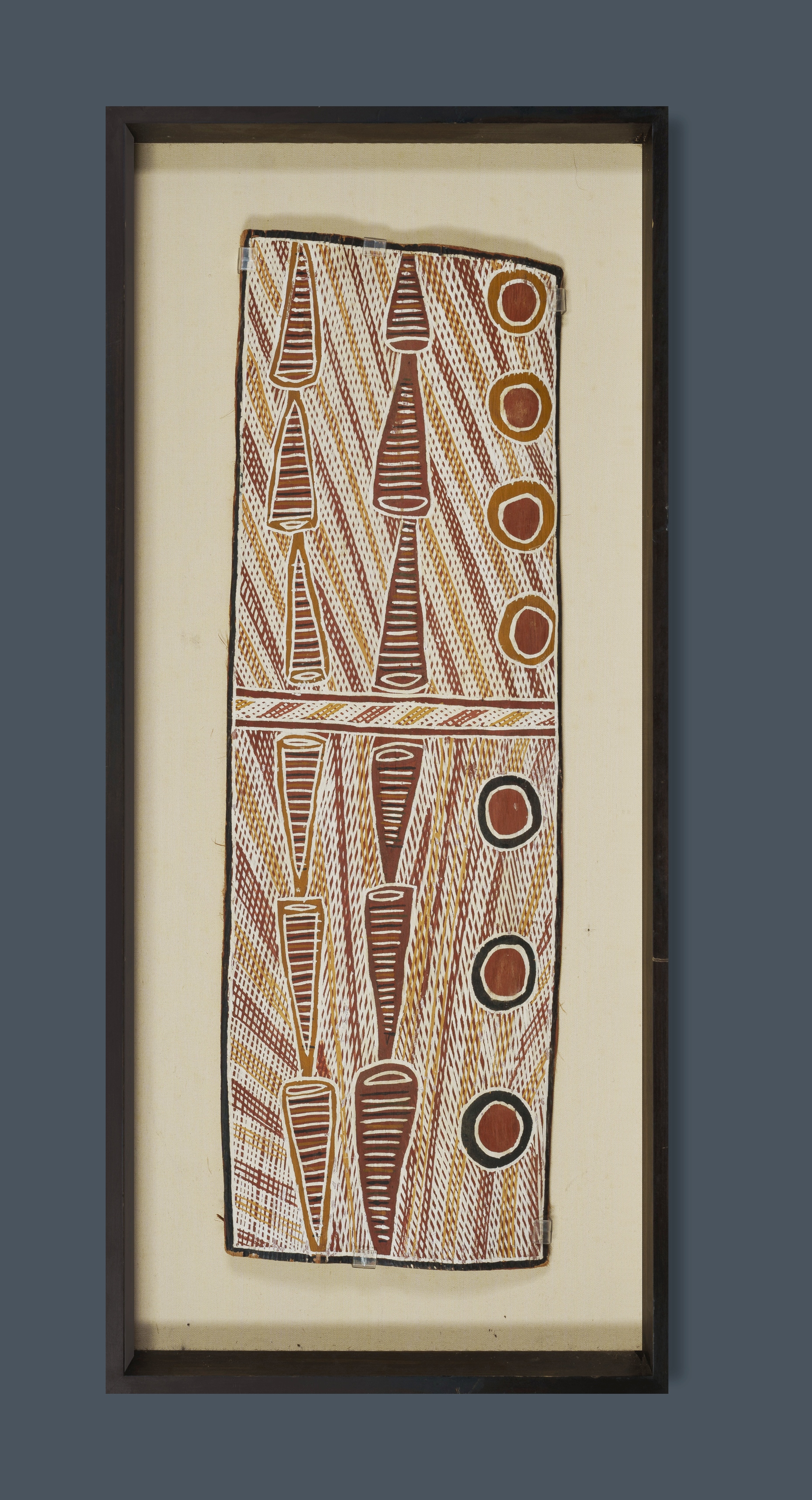 BORBOBANI (Aboriginal School) 'Djanggawul Sisters - Mangrove Shells and Sacred Waterhole,' c.1965. Natural Earth Pigments on Bark 78x25cm (bark) PROVENANCE: Elcho Island, NT; private collection, Victoria.Estimate $450-750