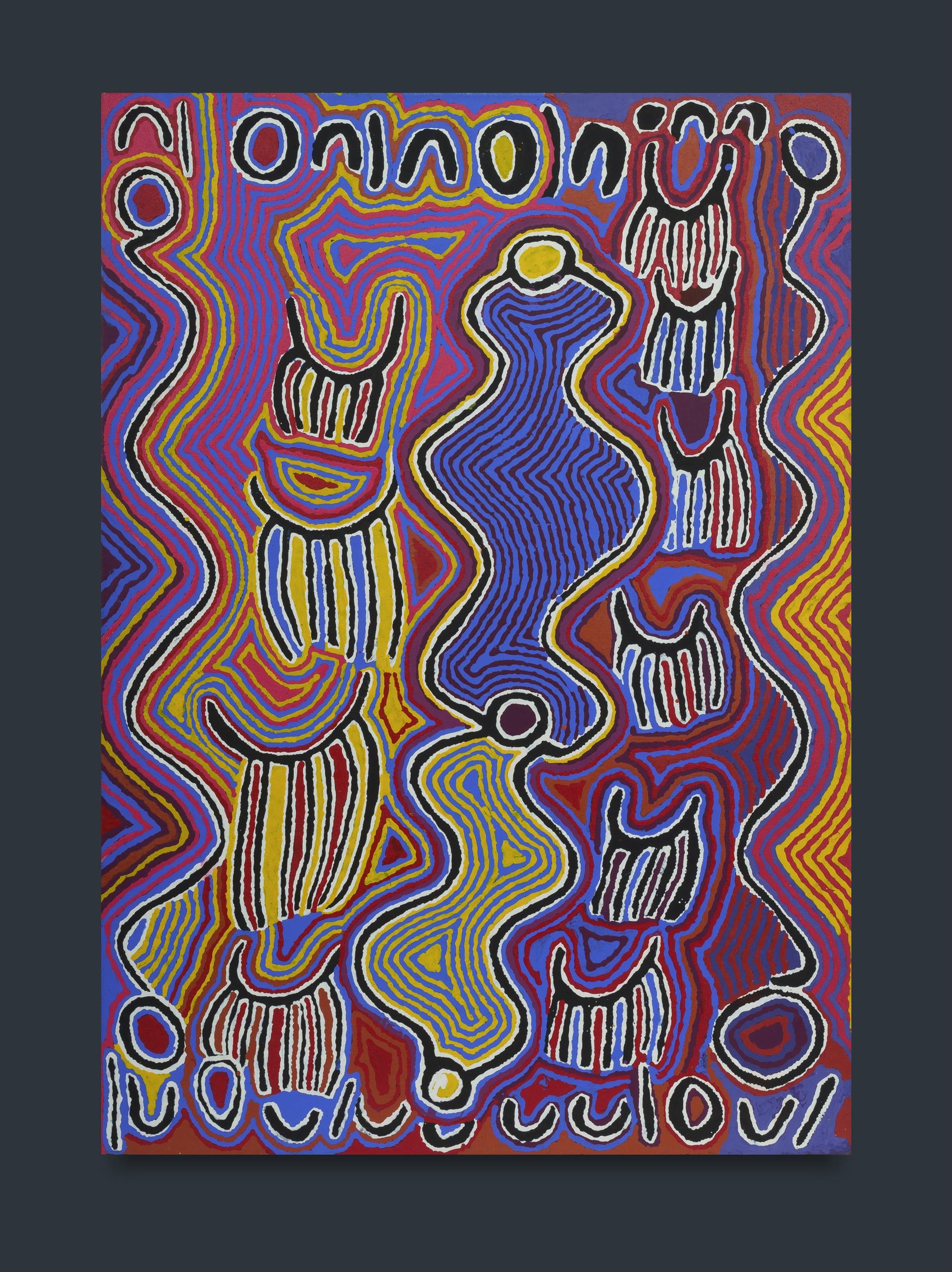 NAPANGARDI, Judy Watson (Aboriginal c.1925-2016) 'Mina Mina Jukurrpa (Mina Mina Dreaming)' 2001. Inscribed verso. Acrylic on Linen 107x76cm PROVENANCE: Warlukurlangu Artists, NT, cat #5/01 (certificate of authenticity included); private collection, NSW.Estimate $1,500-2,500