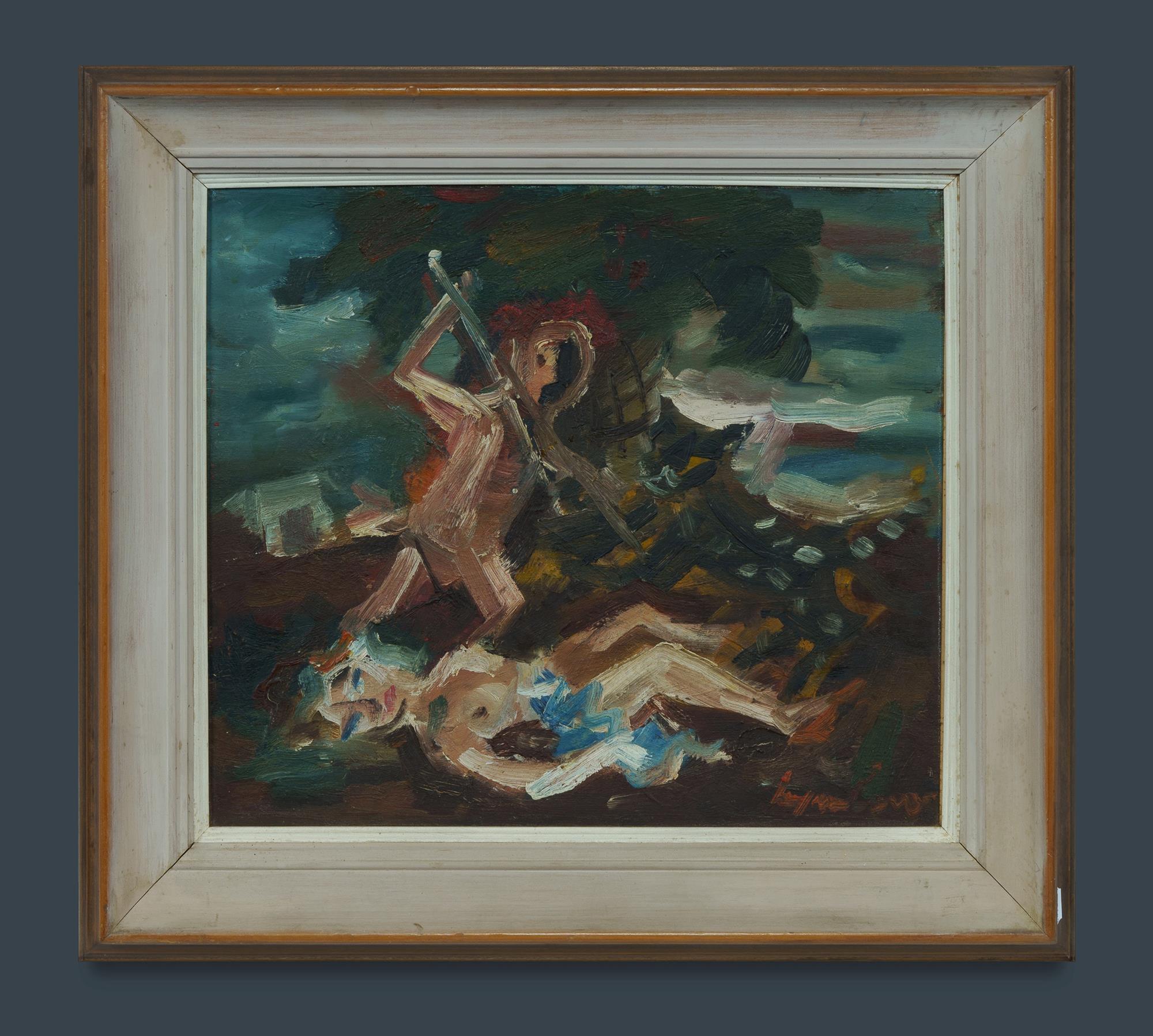 LYMBURNER, Francis (1916-1972) 'The Defender' Signed lower right. Oil on Board 30x34cm PROVENANCE: The Fred and Elinor Wrobel Collection, Sydney; Estate Late Elinor Wrobel.Estimate $800-1,500